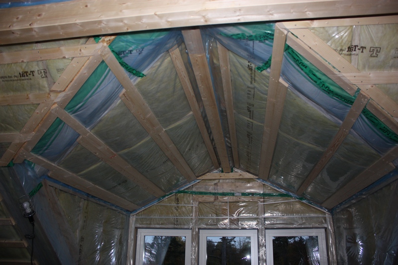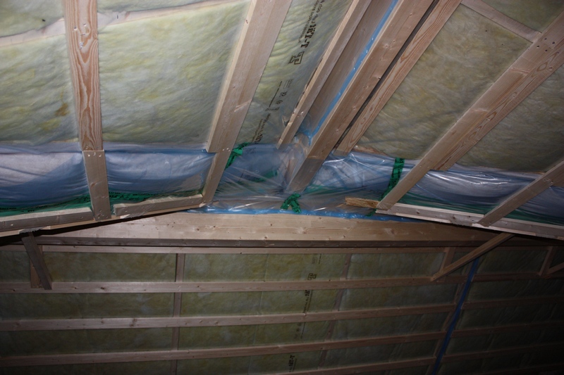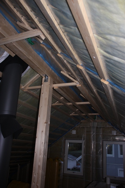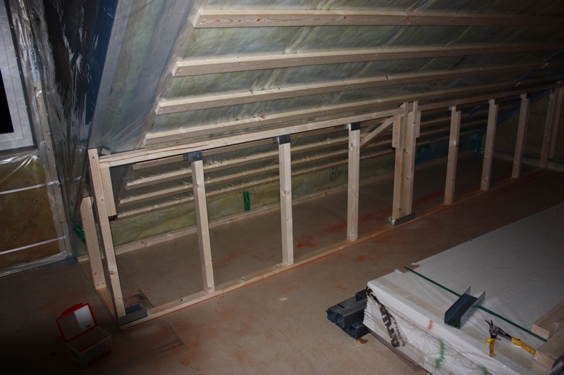 Vi har kattvind tills takhöjden är ca 1 meter och vi tar bara ner takhöjden ca 20 cm från balken för att få plats med ventilation, el och eventuellt annat. Vi bygger inte ett förråd bakom badrummet i nuläget utan låter rummet ”gå runt” det istället för att få så mycket ljus och utrymme som möjligt.