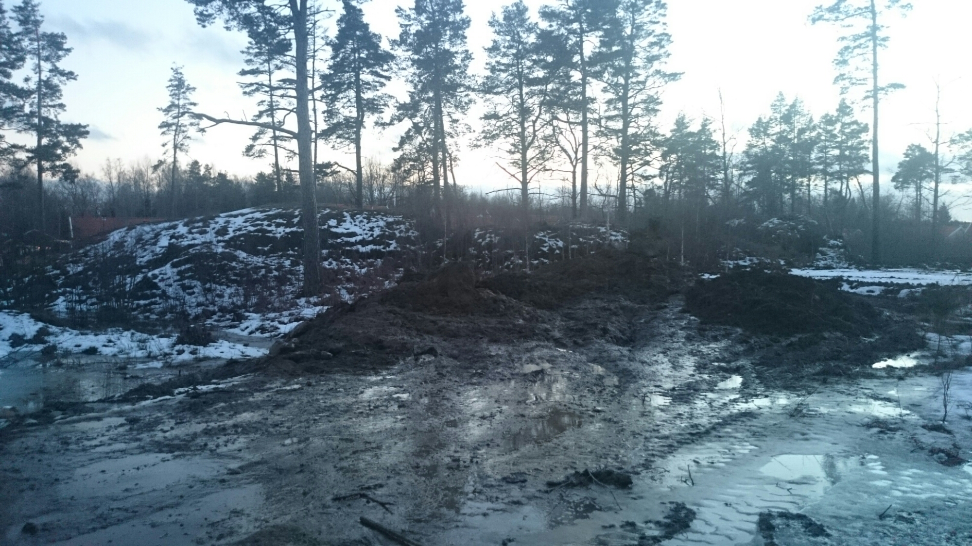 På tomtens baksida finns ett parti som är rejält mycket lägre än resten och dessutom blir vatten stående där efter att en av grannarnas tomt blev utjämnad. Efter en väldigt kort och trevlig (som vanligt) diskussion med Markus på Turbinen kom vi överens om att de skulle fixa det vid ett lämpligt tillfälle. Det lämpliga tillfället inföll med start igår… De behöver bli av med fyllnadsmassor lite brådis och vi tackar inte nej!