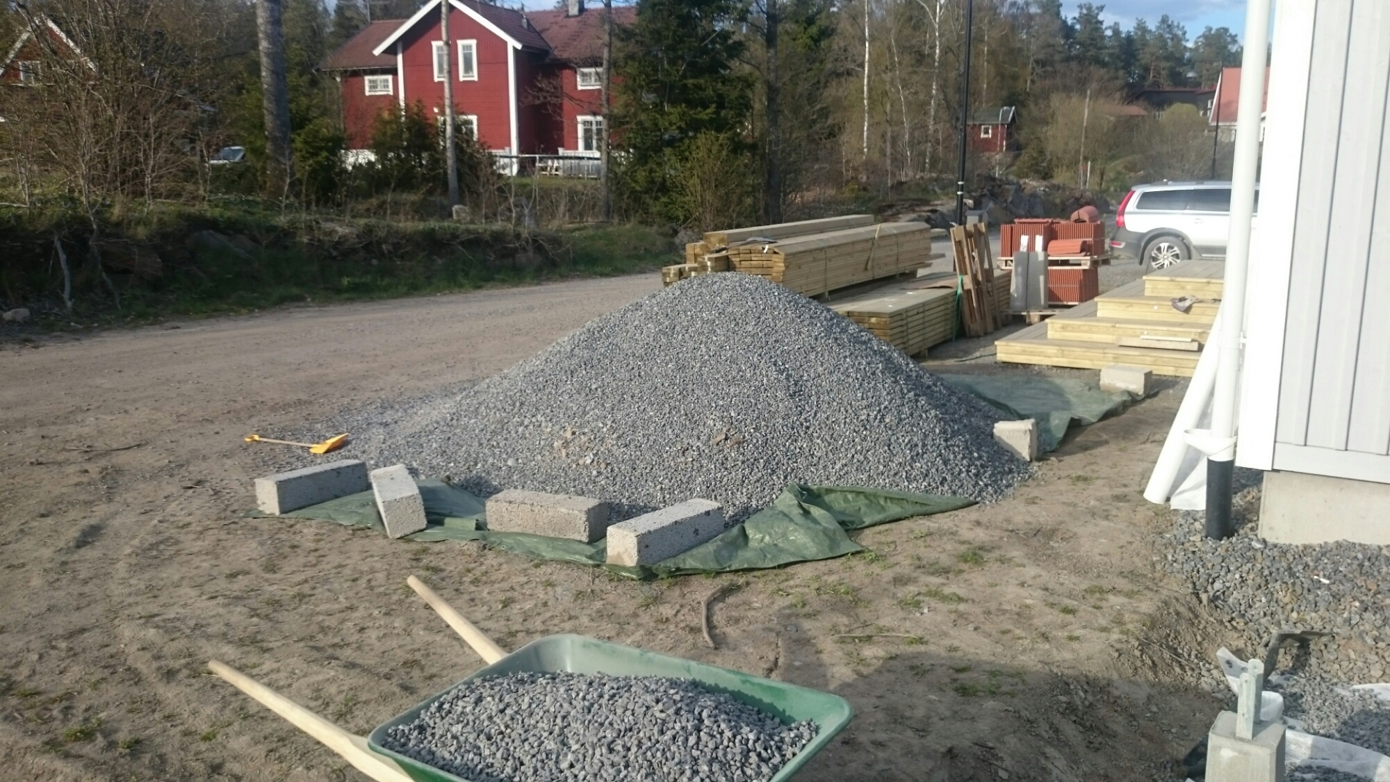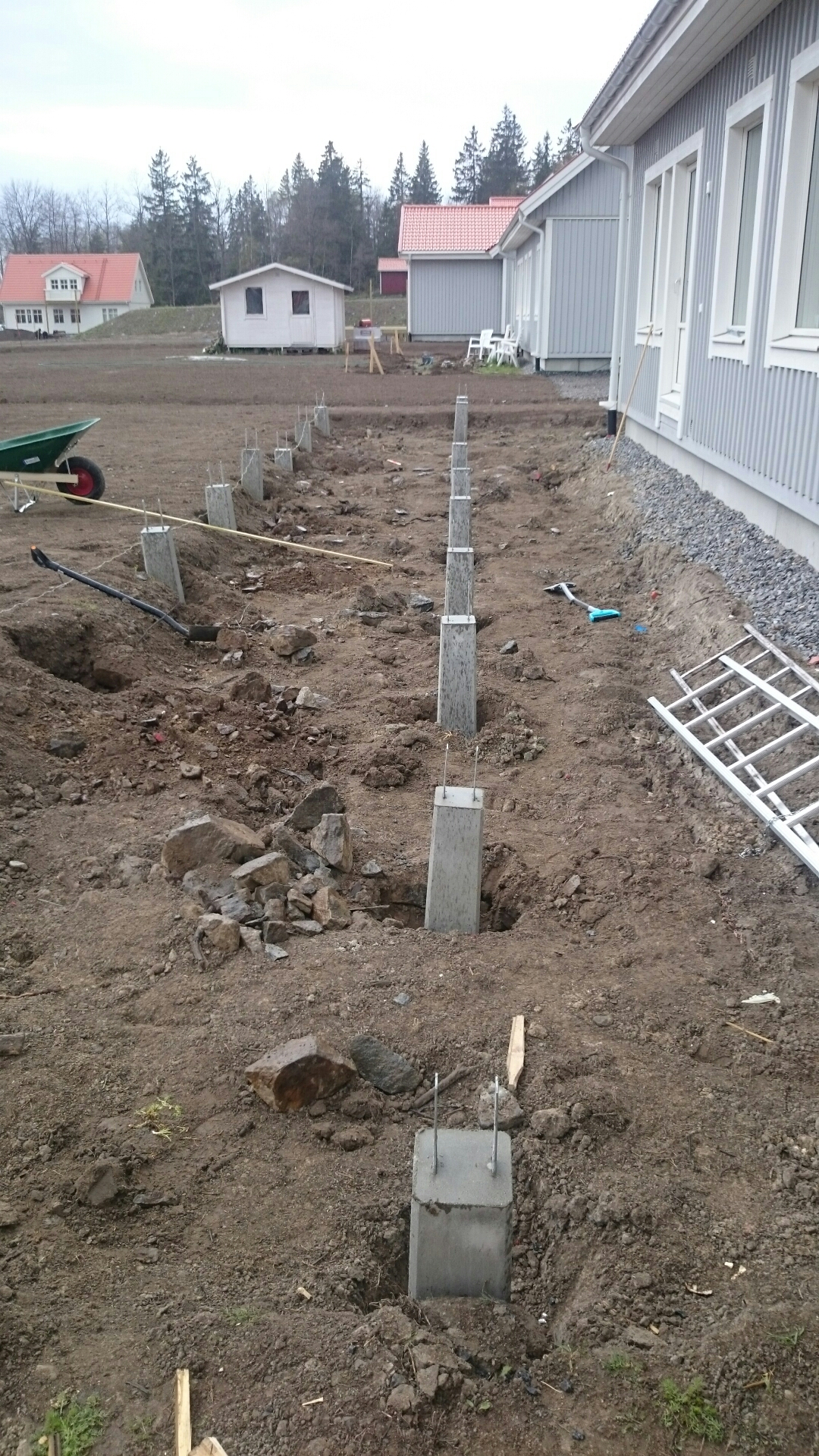 Nu är altanen på gång! Grabbarna som fixade gräsmattan grävde ur hälften av det som behövdes till plintarna och jag har slagits med alla stenar i varierande storlek för att få ner dem den sista biten. Nästan alla plintarna är på plats, bara två som ska placeras efter hur några av reglarna hamnar. Markduk på större delen av ytan och runt ett ton grus utkört. Tur att man fick bra hjälp av grannarnas grabb!