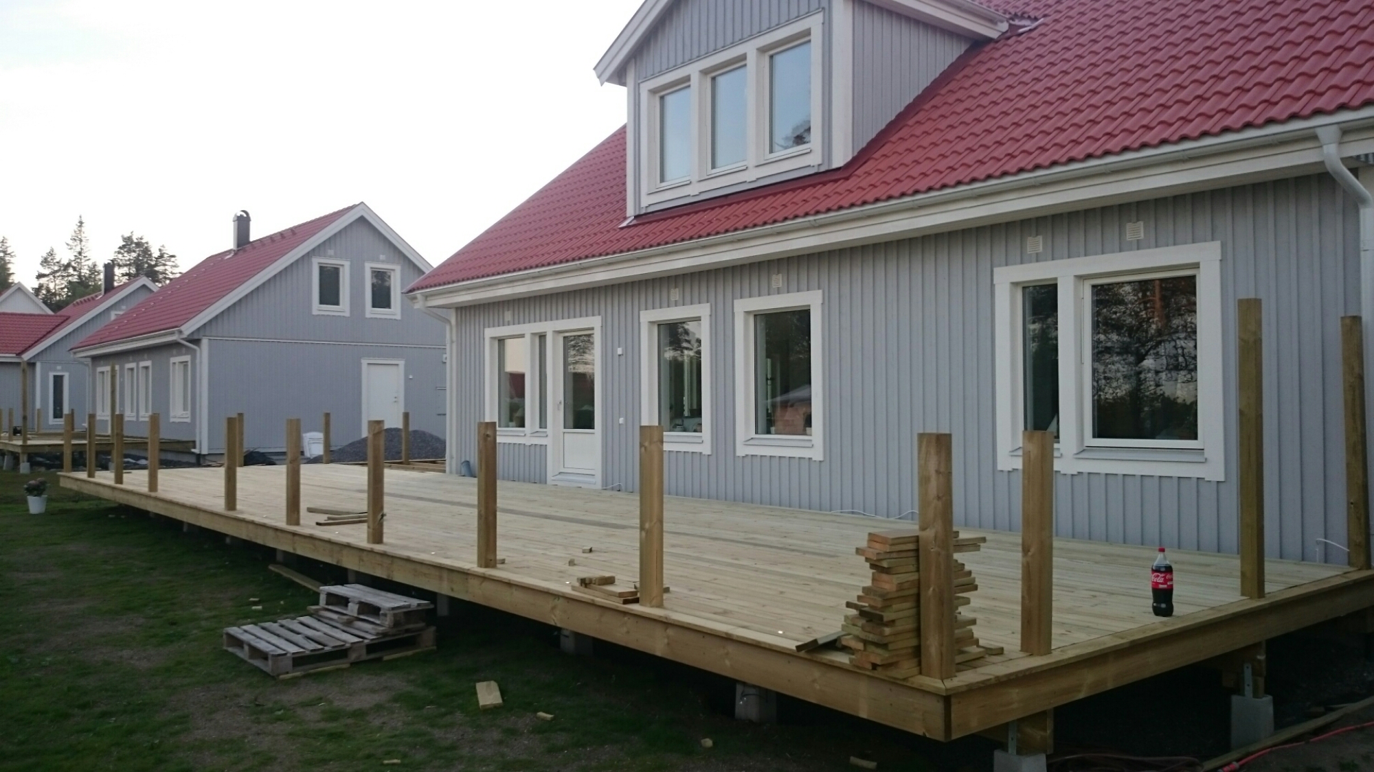 Nu när vädret och tiden är på min sida så passar det bra att mata på lite på altanen. Långsidan är nästan klar, lite jobb med ett av stuprören där vi gärna vill ha renskoppen åtkomlig uppifrån, ta bort röret som binder ihop det med de andra, kapa och sätta dit nytt. Blir nog bra till slut! Stort blir det iallafall 😀