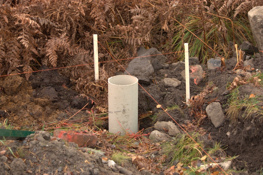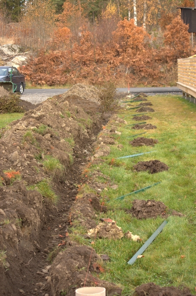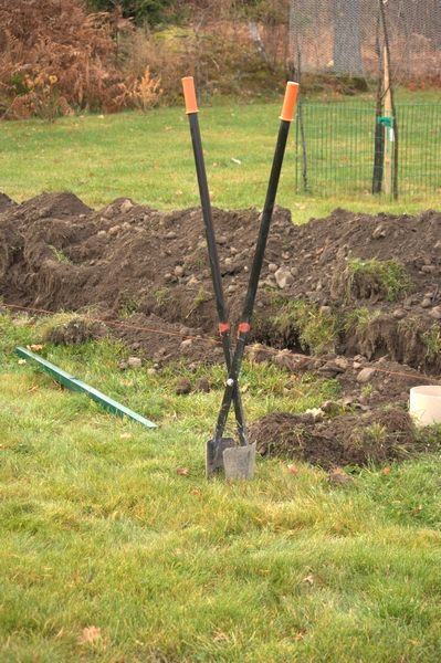 Vi valde till slut att köpa allt monterat och färdigt från Skandinaviska områdesskydd (Stängselbutiken) eftersom de kändes seriösa i kontakten. Robert hette killen som kom ut och kollade lite inför monteringen och enligt honom var det ingen konstigt utan bara att köra på. När det väl var dags för start så kom det inte några killar på morgonen och vid elvatiden ringde vi för att kolla när de tänkte dyka upp, vi hade ju inte bokat någon tid utan bara en dag. Efter lunch blev svaret och vid tvåtiden dök två ”killar” upp. Ingen av dem pratar svenska men den ena helt OK engelska så det löste sig. Det var rätt bra att vara hemma för då kunde vi prata om vissa saker som kanske inte var helt självklart hur de skulle lösas, det mesta blev som de rekommenderade. Första dagen grävdes hålen men en lite speciell ”spade”.