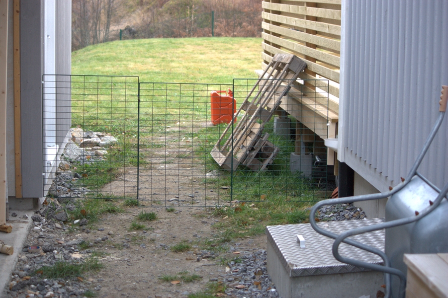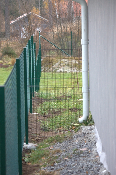 Nu har vi till slut lyckats bestämma oss och fått uppsatt ett staket på tre av tomtens sidor. Vi har ju två hundar som helst vill kunna vara ute med oss och fram tills nu har det inneburit lina eller instängda på altanen.