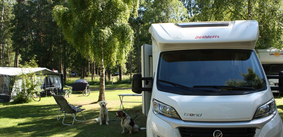 Där tältet i bakgrunden står stod vi förra året när vi skulle till utställning i Alfta. Hundarna är en av anledningarna till att vi valt att köra relativt korta sträckor, 20 till 30 mil, och försöka komma fram tidigt på eftermiddagen. Båda hundarna tycker att husbilsåkandet är rätt tråkigt och vi tycker att det är skönt att komma på plats i lugn och ro för att kunna utforska närområdet med lite hundpromenader.