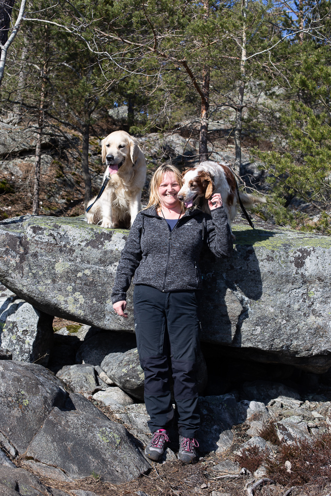 Det finns gott om stenar i olika storlek runt slingan, vissa snubblar man på och vissa fungerar bra att sätta hundarna på.