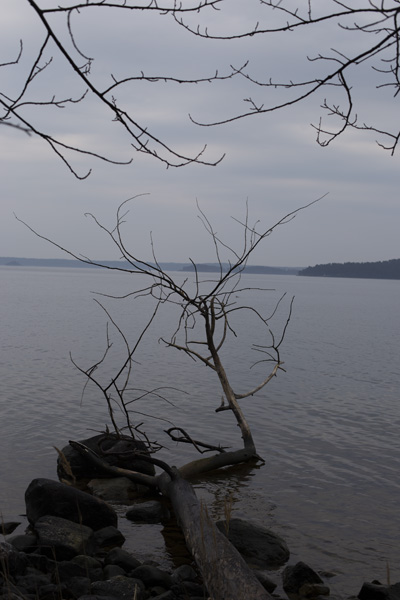 Längs stranden finns flera träd som fallit ut mot vattnet och skapar perfekta ställen att sätta sig eller helt enkelt blivit underbart vackra skuplturer.