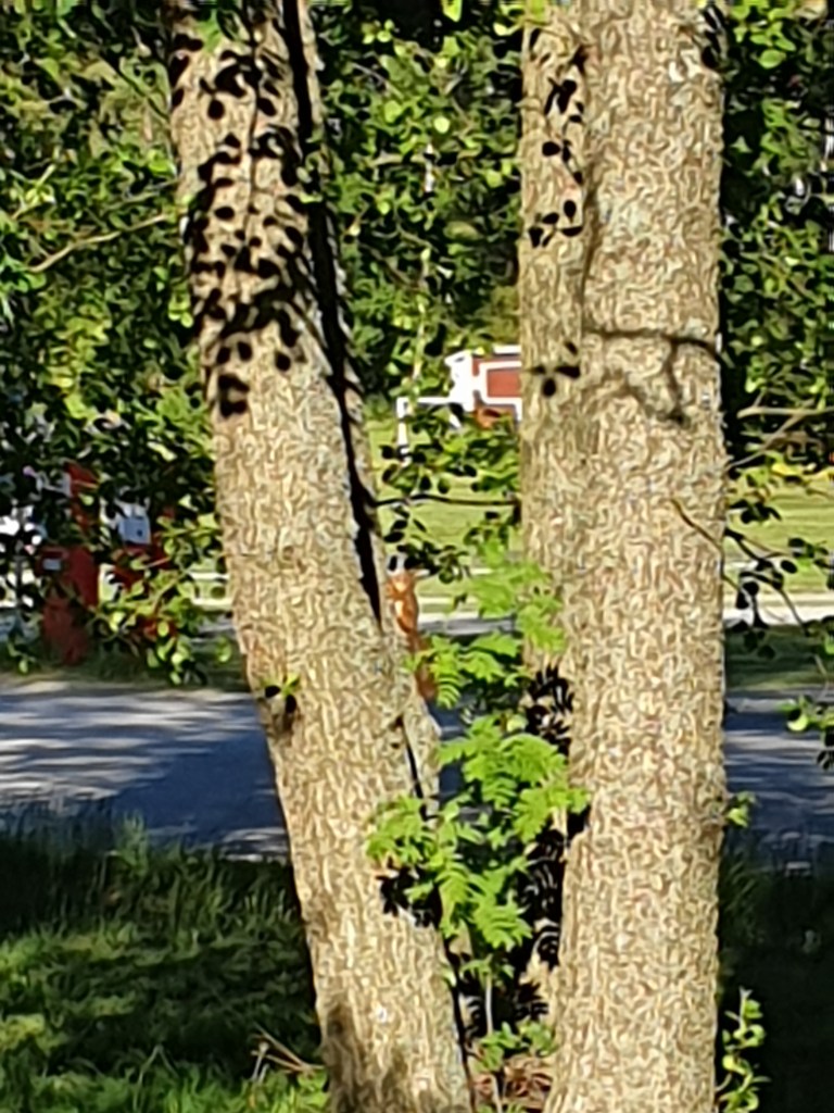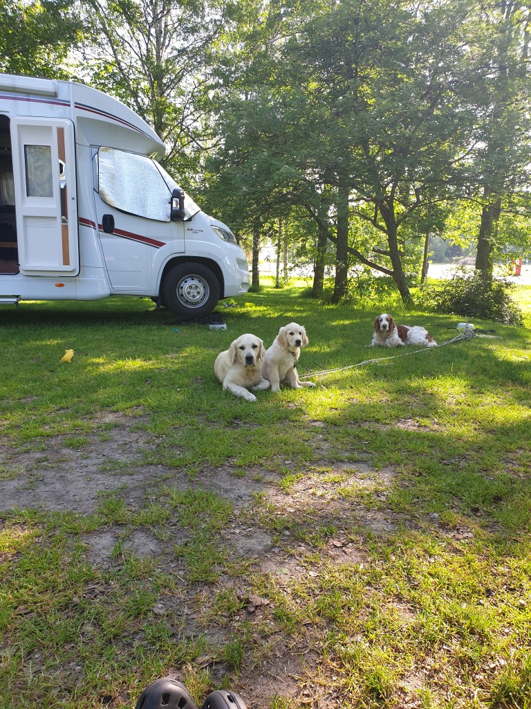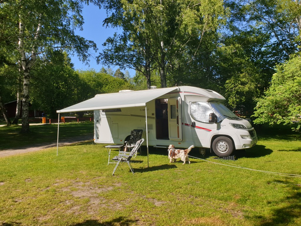 Onsdag efter att jag jobbat färdigt stoppade vi in det sista (vi glömde hushållspapper) i husbilen, spände fast hundarna i sina selar och åkte de två milen till Gålö. Knasens första tur i husbilen och han var mer avslappnad än de som varit med i flera år! Hans sele är kanske inte riktigt rätt modell för bilbruk men jag har inte lust att köpa en ny av samma sort som de andra har innan han är uppe i rätt storlek. Jag valde plats nummer 1 och fick OK på att ställa bilen åt ”fel” håll eftersom det ändå inte finns en tomt bakom bilen. Sol större delen av dagen någonstans på platsen samtidigt som träden gav skugga åt hundarna, perfekt!