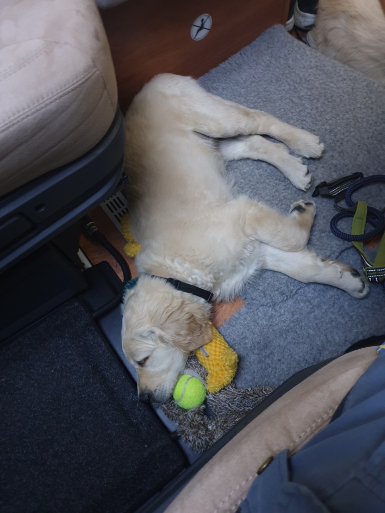 Dagen startade precis som hemma klockan 6 i morse när klockan ringde. Upp och fixa valpens frukost, klä på sig och ut med honom för morgontoalett lite snabbt innan det var dags för de stora hundarnas morgonpromenad. Helén fick inte sova vidare för Knasen utan även hon blev tvungen att gå upp ganska direkt.