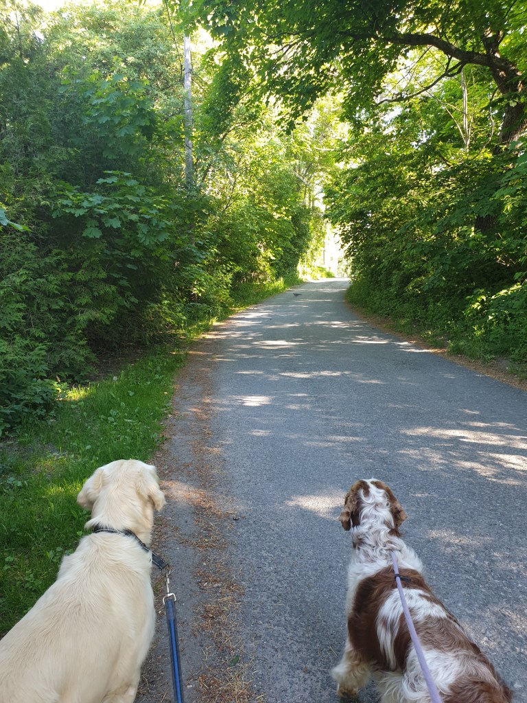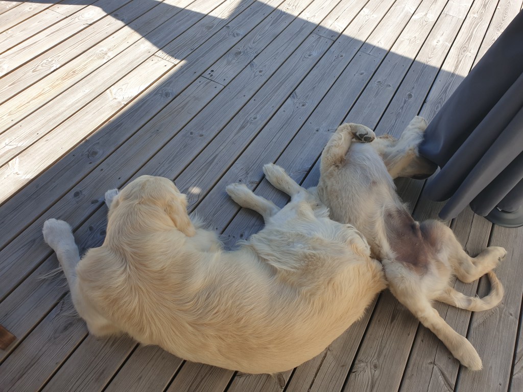 Värmen påverkar våra hundar rätt mycket så den längre promenade på morgonen får bli rätt tidig för deras skull. När vi är hemma ligger de helst i skuggan på altanen eller rör sig på gräsmattan. Atlas föredrar dock att lägga sig inne hos Helén när hon sover efter nattens arbete, där finns det nämligen AC!