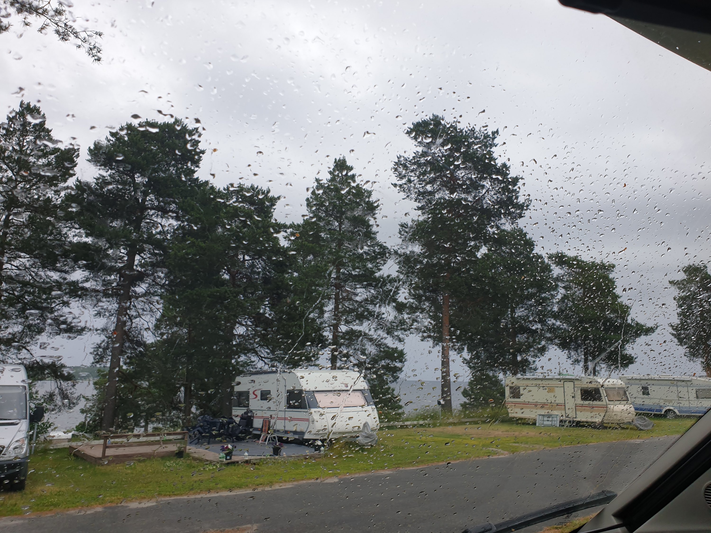 När vi kom fram och hade fått upp bilen på klossarna kom regnet… Inte oväntat men dessbättre avtog det ibland så hundarna inte blev alltför blöta på promenaden och grillandet kunde genomföras.
