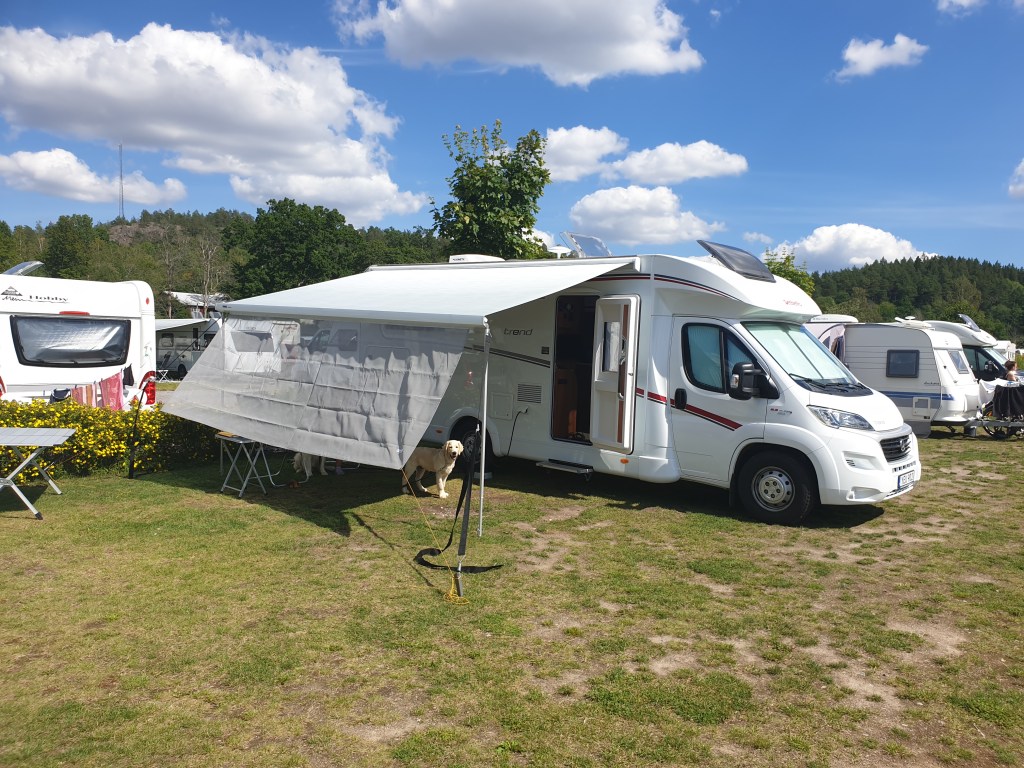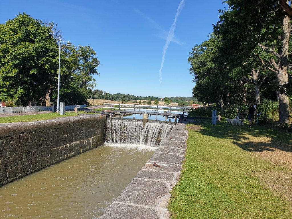 Först hade vi en tanke om att runda Vättern och ställde in siktet på Tiveden Camping men där får man tydligen bara ha två hundar med sig och vi har ju tre… Den campingen gick bort och kommer att göra det länge! Vi bestämde oss för att åka till Söderköping och Skeppsdockans camping två nätter, inget bokbart men det fanns några lediga platser och vi fick en på andra raden från Göta kanal.