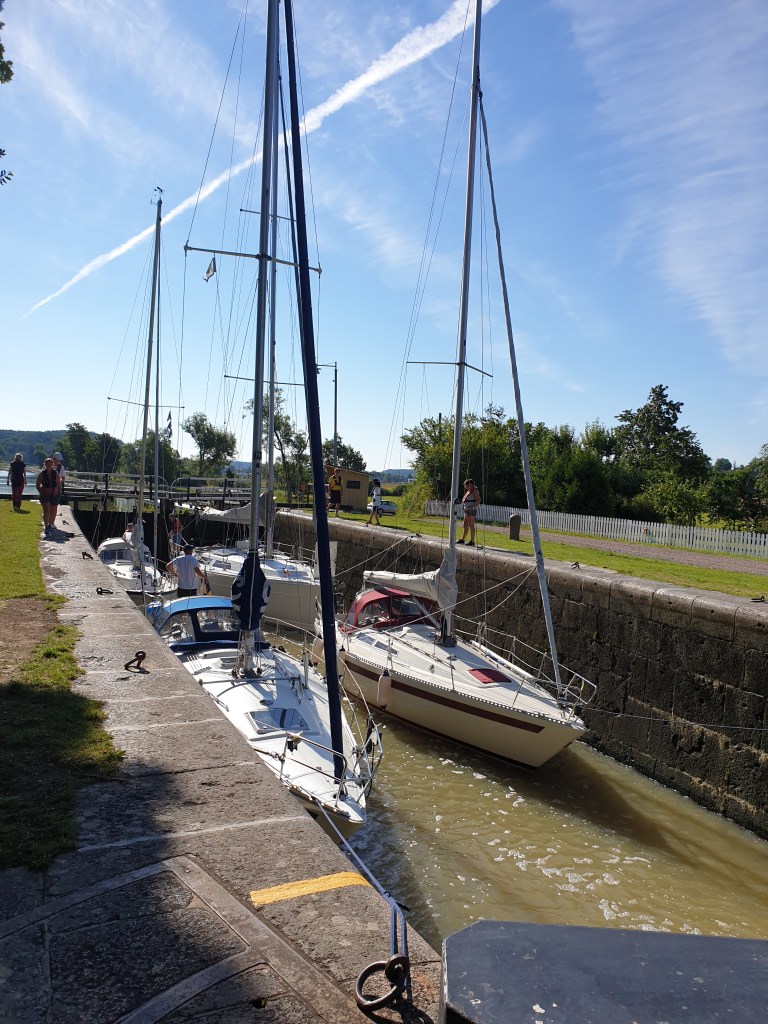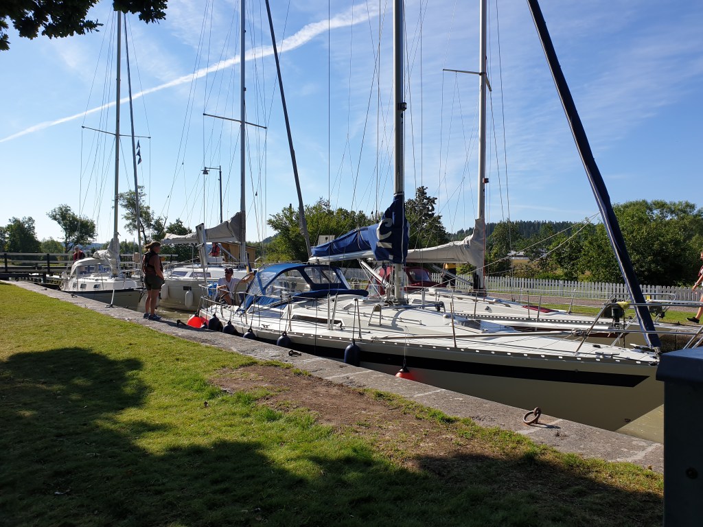 Vi tog givetvis en promenad till den närmaste slussen som ligger inom den sträcka som Knasen får gå och hade turen att det precis var dags för slussning uppåt för fyra segelbåtar. De två första var kompisar och hade gjort det flera gånger förr vilket syntes! Dessutom var de kanontrevliga och ville givetvis hälsa på Knasen. Den största båten var en Hanse 40 fotare och den var inte lika väl förberedd för slussning och var dessutom så hög att frun inte kunde komma ombord när väl båten var uppe!
