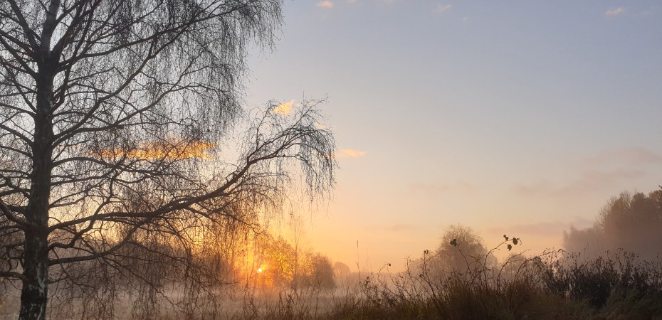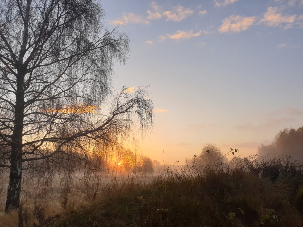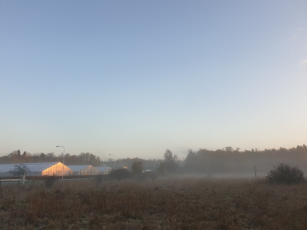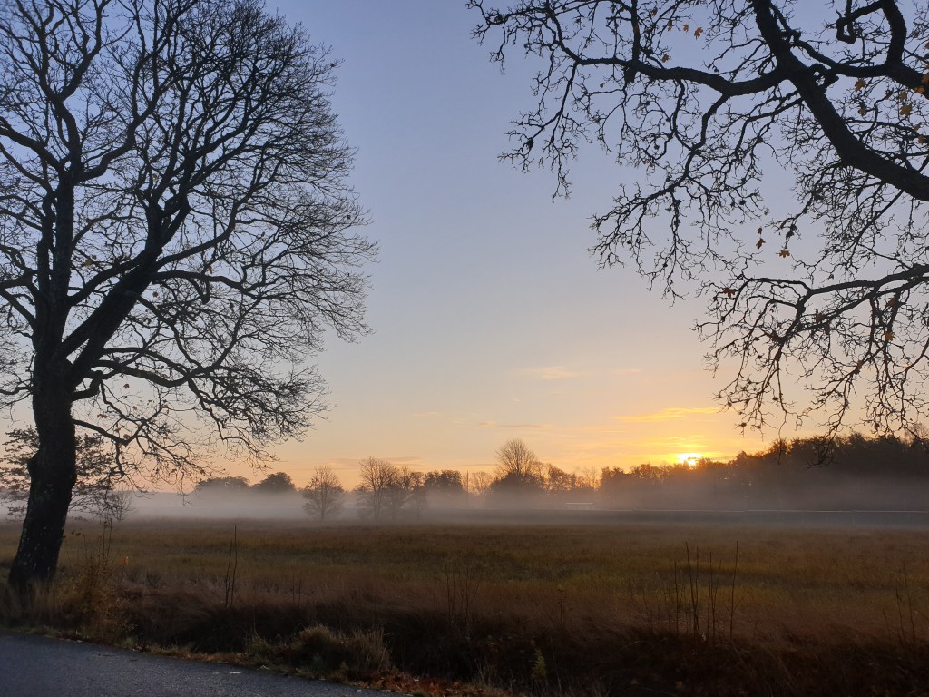 När det här j-a viruset slog till i våras och vi blev hemskickade tog jag över morgonpromenaderna med våra äldre hundar och det har jag fortsatt med nu när vi kör ungefär som tidigare, underbart för det mesta! Sista veckan har det varit ganska fuktigt när jag går ut vilket resulterat i vackert dis i samband med solens uppgång. Mobilens kamera räcker långt faktiskt även om min Canon EOS D6 är bättre när det ska gå fort, passa exakt i tid och så vidare.