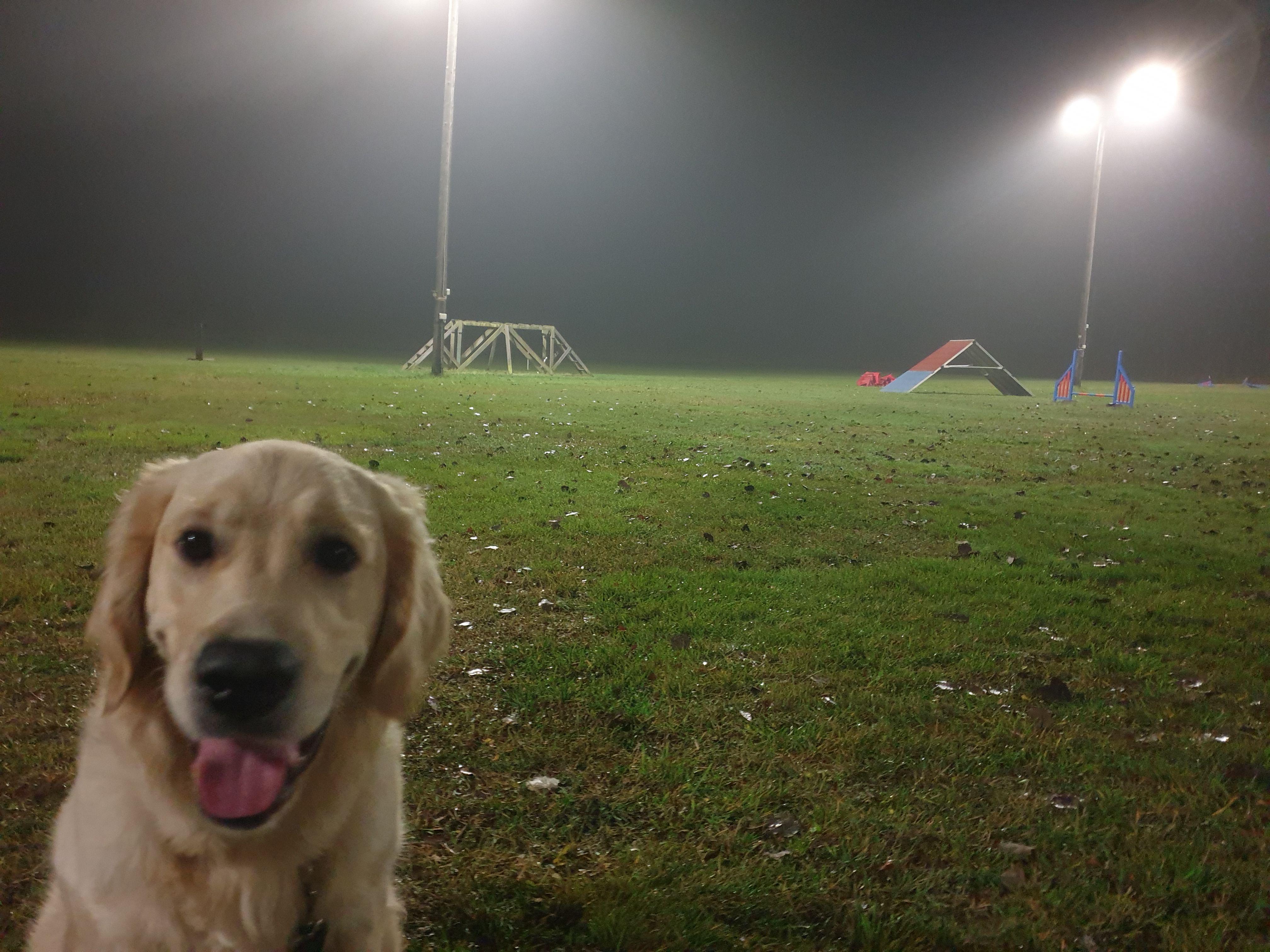 Tanken var att Helén skulle träna Knasen helt och jag bara skulle stötta men kurserna som finns går oftast kvällstid vilket inte passar med hennes jobb så nu får jag ta en kurs på Nynäshamns BK för att hålla igång träningen. Hyfsat mörkt när man kör ut dit men jag kan vägen sedan tidigare kurser, Själva planen är belyst så där är det inga problem.