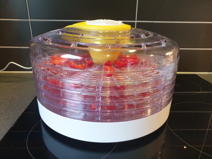 Gröna fingrar finns det folk som har men vi är nog rätt normalbegåvade på den fronten. Vi har ett mindre trädgårdsland som brukar ge lite potatis, lök, morötter och annat utan att vi lägger ner alltför mycket ansträngning. En hel del ansträngning har dock Helén lagt ner på årets habanero. Vi har hittills plockat runt 50 frukter av denna heta chilivariant och årets skörd verkar vara ännu starkare än förra året! En del delade vi och frös in som förra året men de flesta valde vi att köra i torken för att så småningom göra pulver av dem, och idag var det dags!