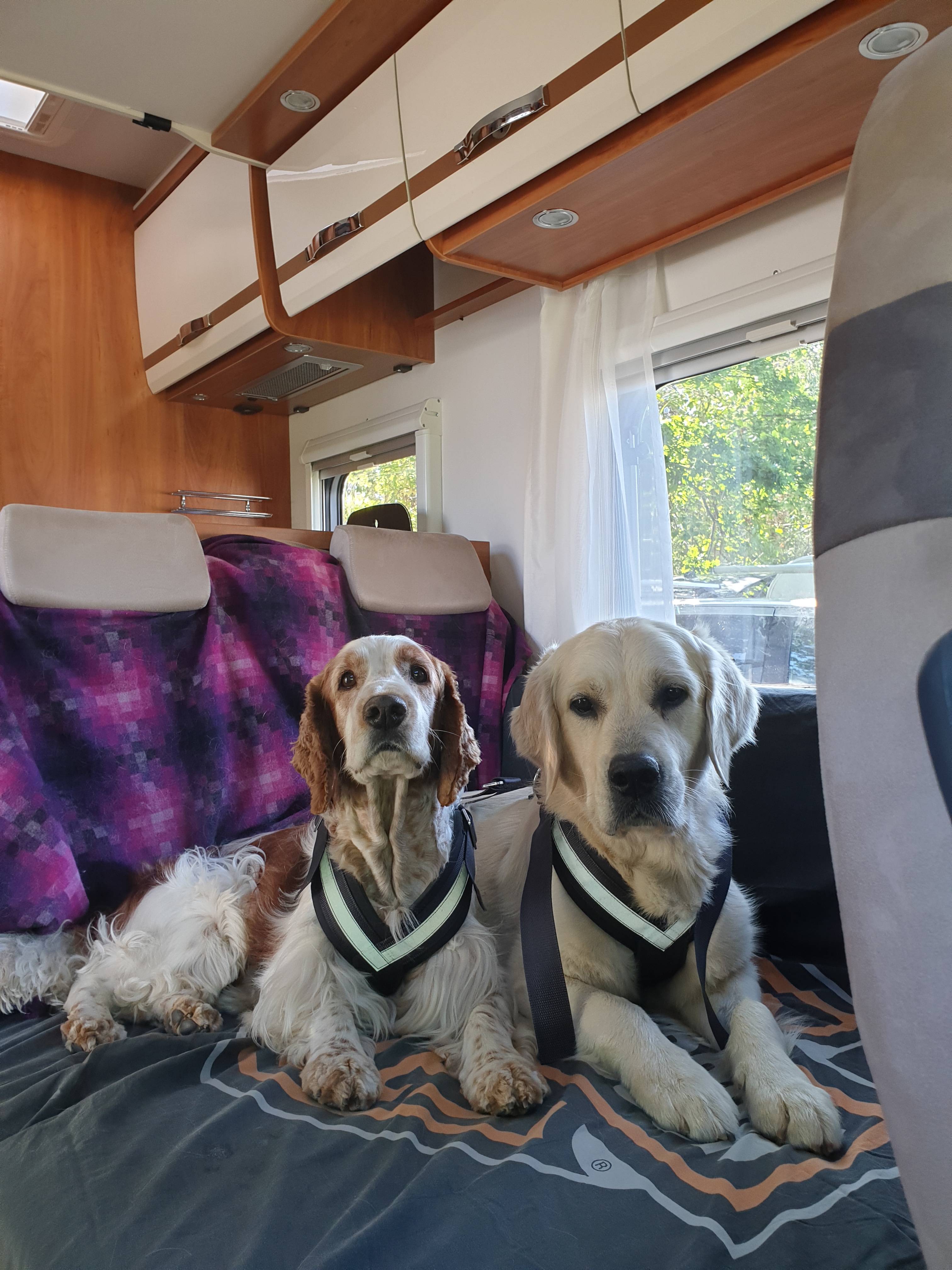 En vanlig fråga är hur man har hundarna i husbilen med tanke på säkerhet, välbefinnande och alla andra funderingar som finns och bilden ovan är den bild som jag lagt upp som svar flest gånger oavsett kategori över huvud taget på samtliga sociala medier. Numera har vi ju tre hundar och det är dags att införskaffa en bra sele även till Knasen inför nästa sommar.