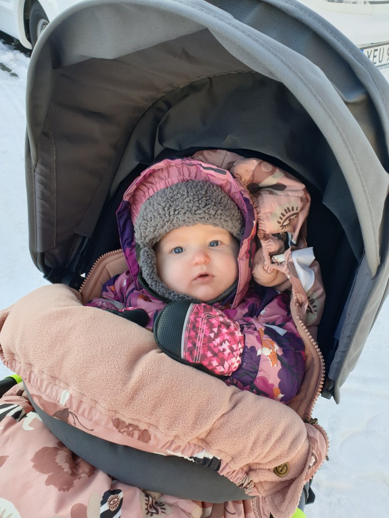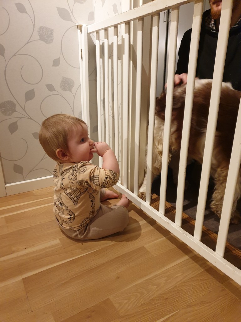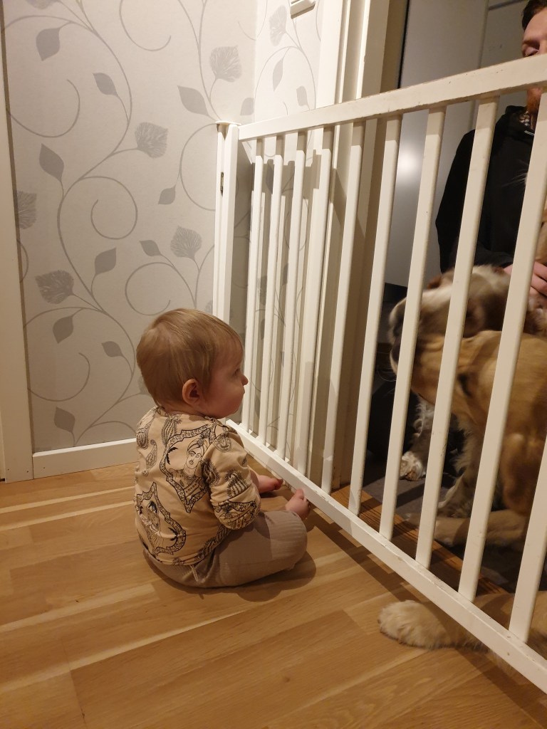 När vi kom hem hade Junie sovit färdigt och efter lite lunch för oss alla tog vi ut hundarna på baksidan så de fick ”rasa av sig” lite och sen kom de andra ut så Junie skulle få se och bekanta sig med hundarna i full fart, inne kryper hon hela tiden bort till grinden där de är och verkar gilla dem lika mycket som de är nyfikna på henne, hundar och barn är en underbar kombination.