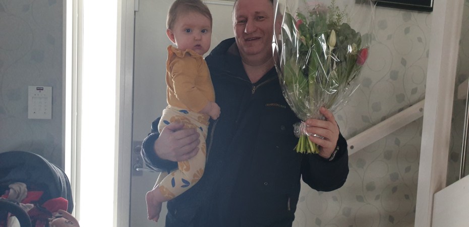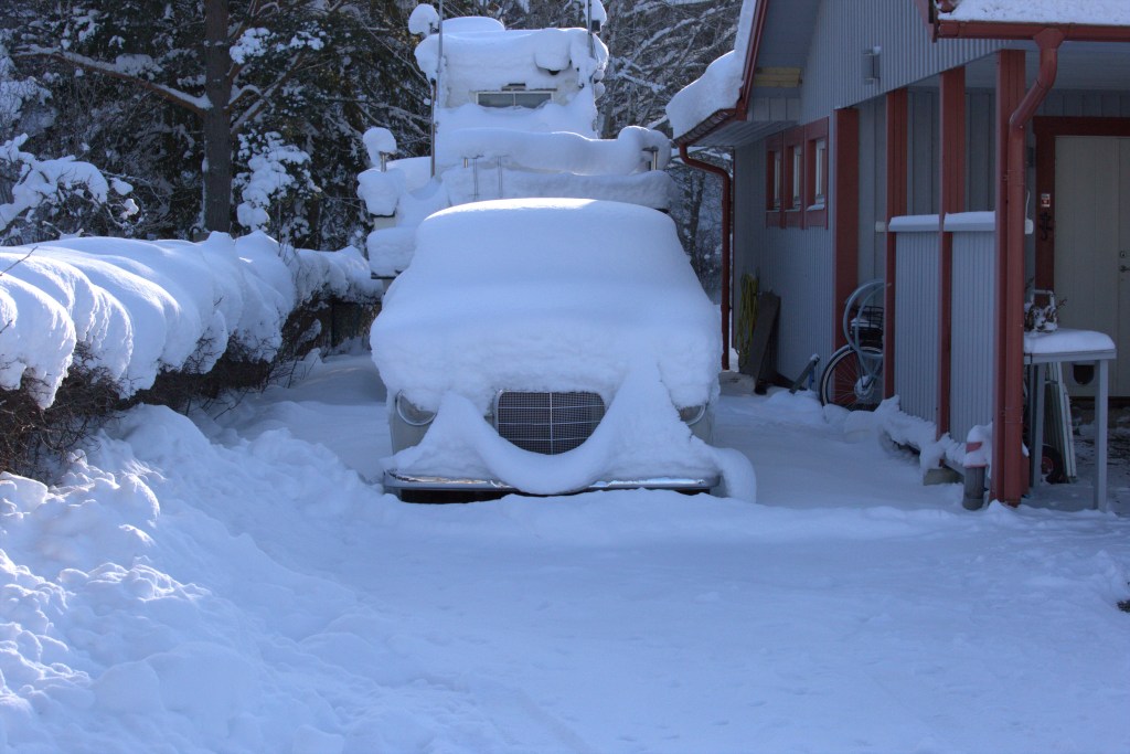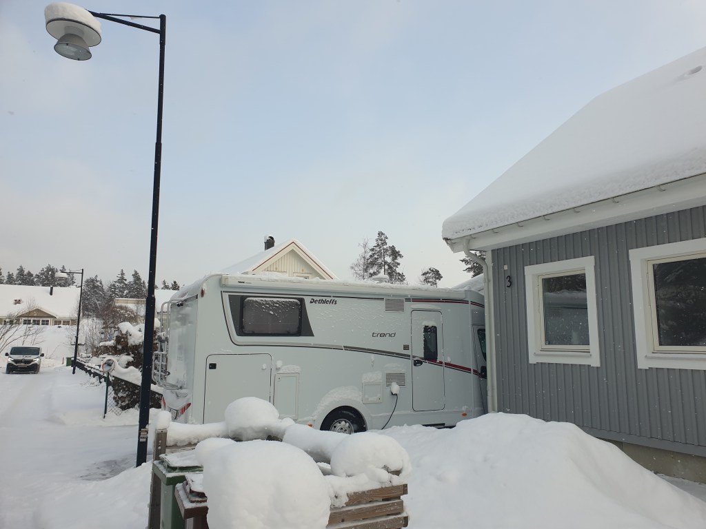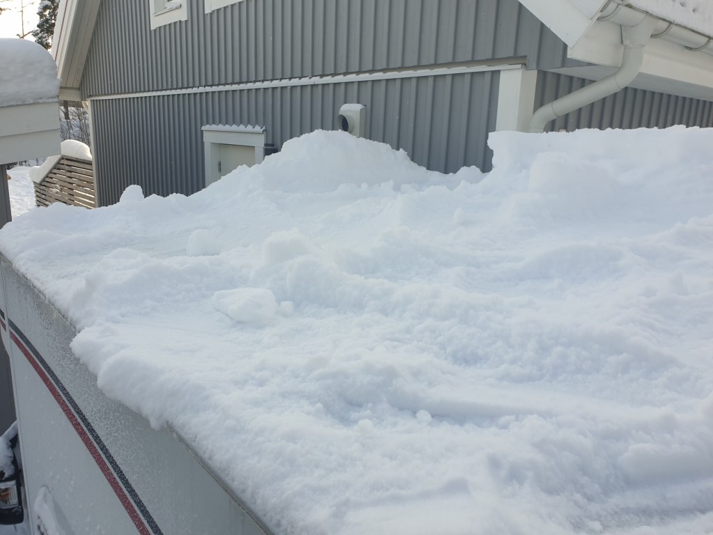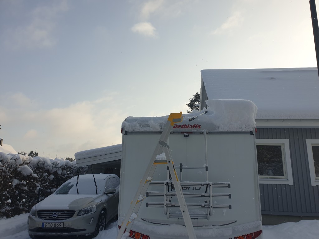 Efter allt nöje var det dags att ta lite tag i snön på husbilen, normalt blåser det bort innan det samlas högt men i år kom snön fort och utan vind så det vart runt fyra decimeter så jag ville få bort det innan det blev ännu mer eller började smälta och orsaka problem. Vi köpte en bra stege i somras som gör jobbet betydligt säkrare! När jag var nästan färdig kom ett blombud från Kent och Åsa, tack!