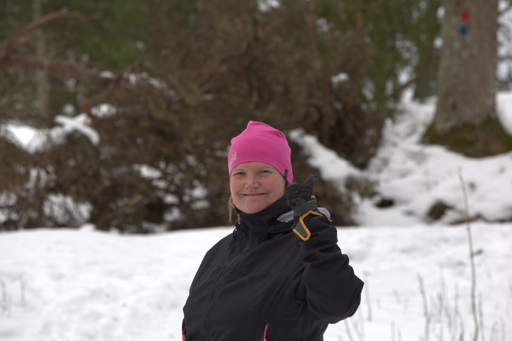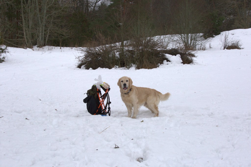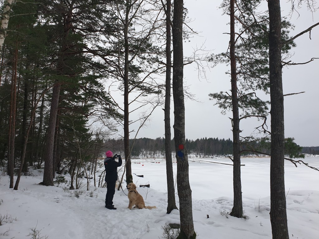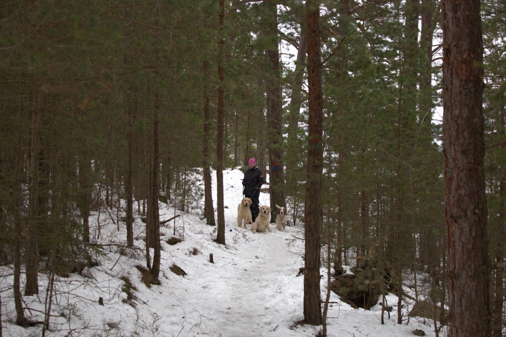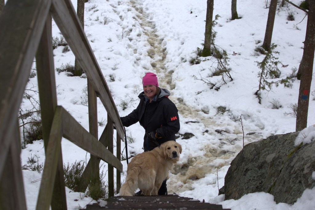 Själva slingan håller på att töa men i början var snön rätt lätt att gå i, mot slutet var det rätt moddigt så halkrisken var desto större. Helén lyckades halka och glida tillbaka på magen vid ett tillfälle, inte ens ett blåmärke, men då blev det inte något foto (lite rädd om livet är man ju). Oväntat mycket folk i det rätt tråkiga vädret, vi såg väl ett tiotal på de timmar vi gick. Den första vi träffade på var en bekant inom hundvärlden som kom med sina fyra jaktcocker, härliga allihop! Kul att träffas och få snacka några minuter.