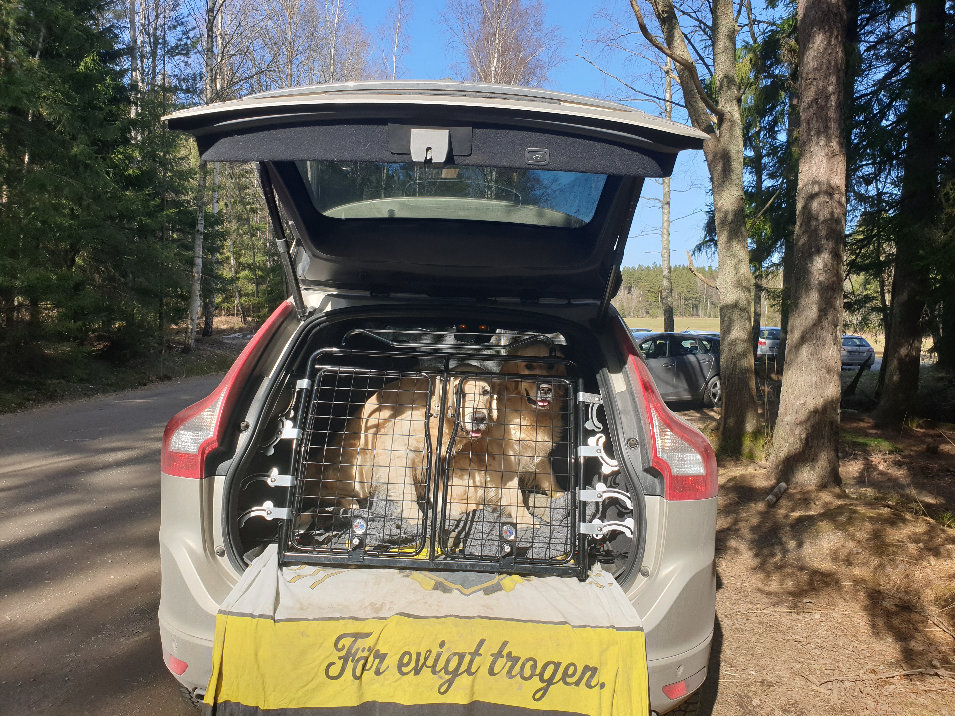 Vi inledde ju med en tur på Sundby Gård på fredagen men lördagens promenad blev här hemma. Vi satt och njöt i solen på altanen ett tag medans hundarna njöt av att det är tillräckligt torrt för dem att kunna njuta av tomten. På eftermiddagen åkte vi till skogen och la viltspår som vi skulle gå dan därpå.