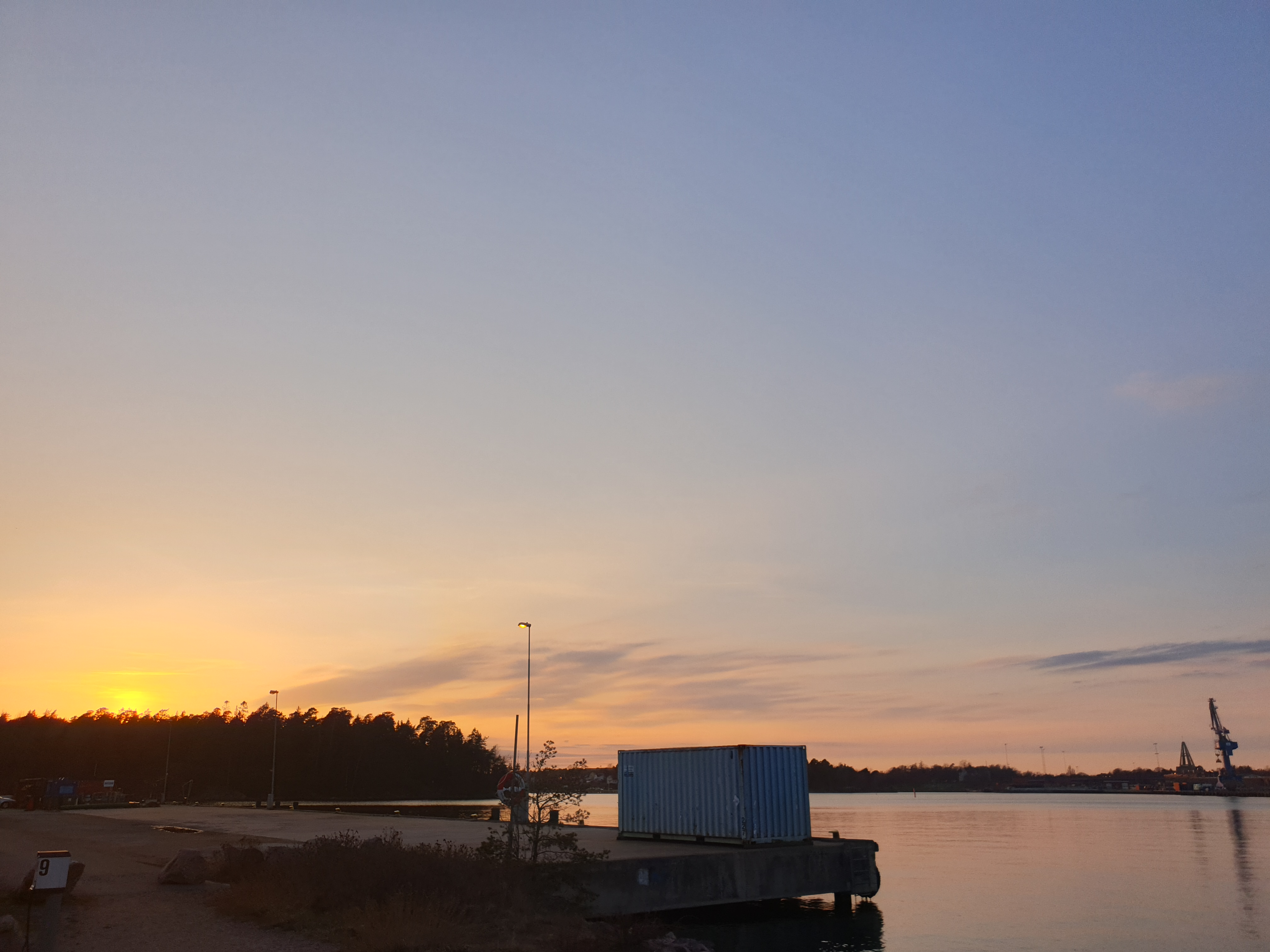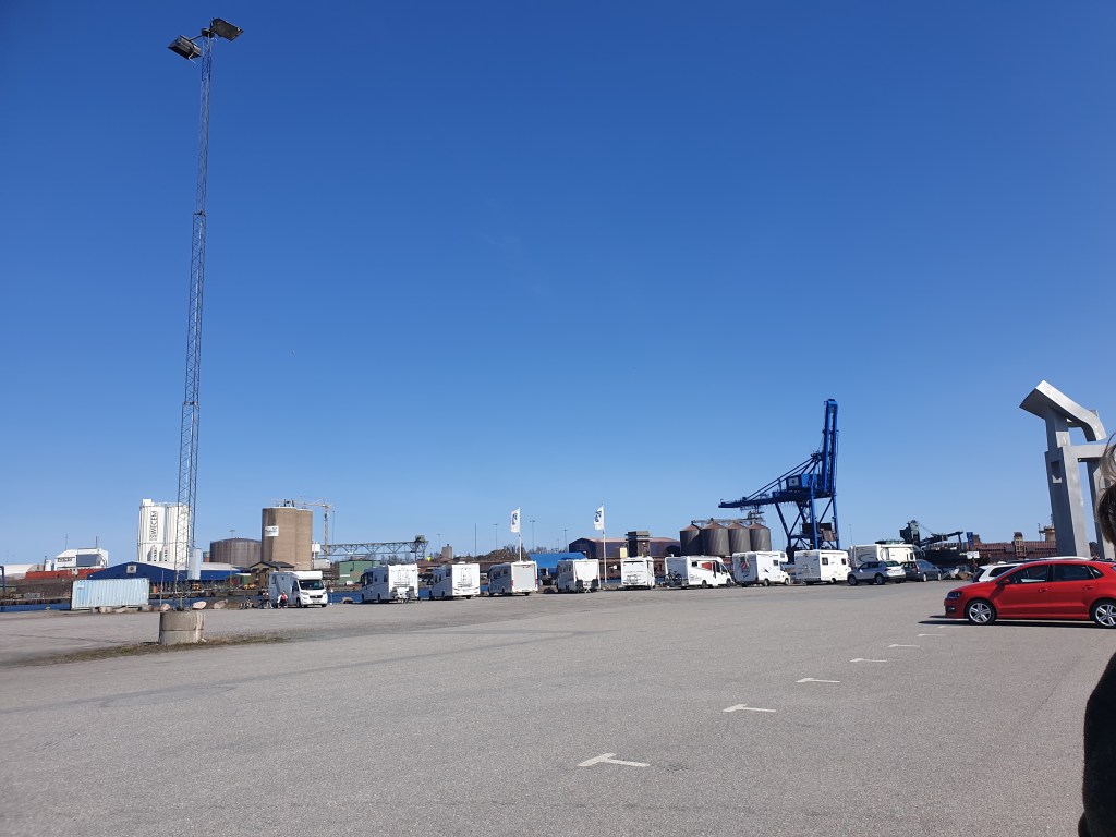 Femöre är en fiskehamn men av den sortens aktivitet såg vi inte mycket. Rakt framför vår bil däremot ligger den egentliga hamnen av mer industriell karaktär och där var det verksamhet rätt sent igår och de startade upp klockan sex imorse men det är helt OK ljudnivå enligt mig.