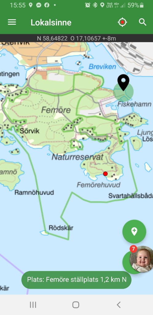 Vi står väldigt sällan på ställplats men har länge funderat på Femöre i Oxelösund så vi styrde iväg vid tiotiden. När vi kom dit någon minut i tolv såg det ut som vi inte skulle få plats med el men vi blev invinkade mot en plats av en mycket trevlig Dethleffs-ägare som samtidigt såg till att personbilen som ställt sig fel flyttade på sig, sista platsen med el blev vår!