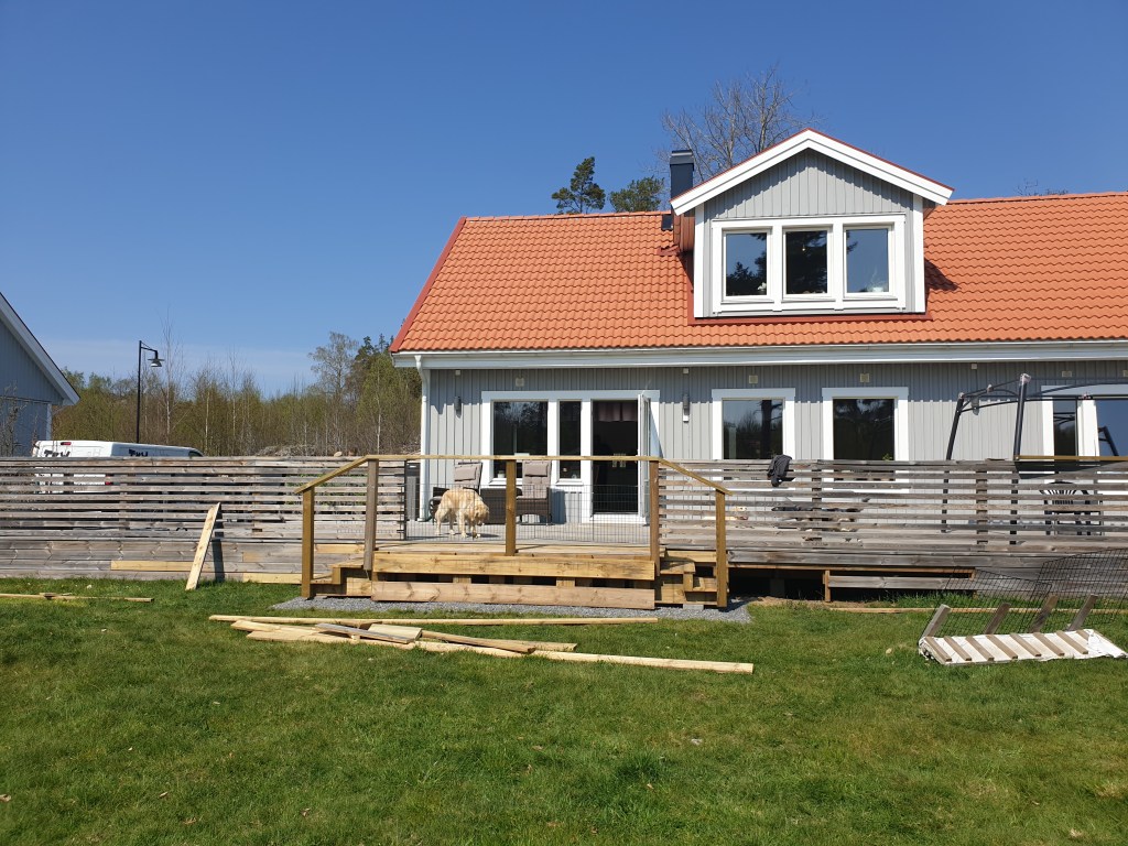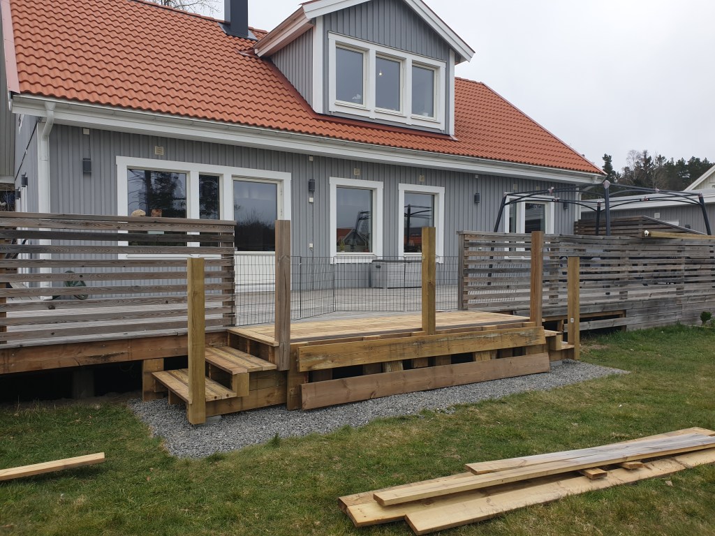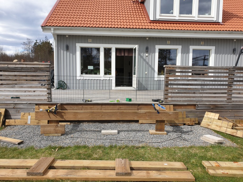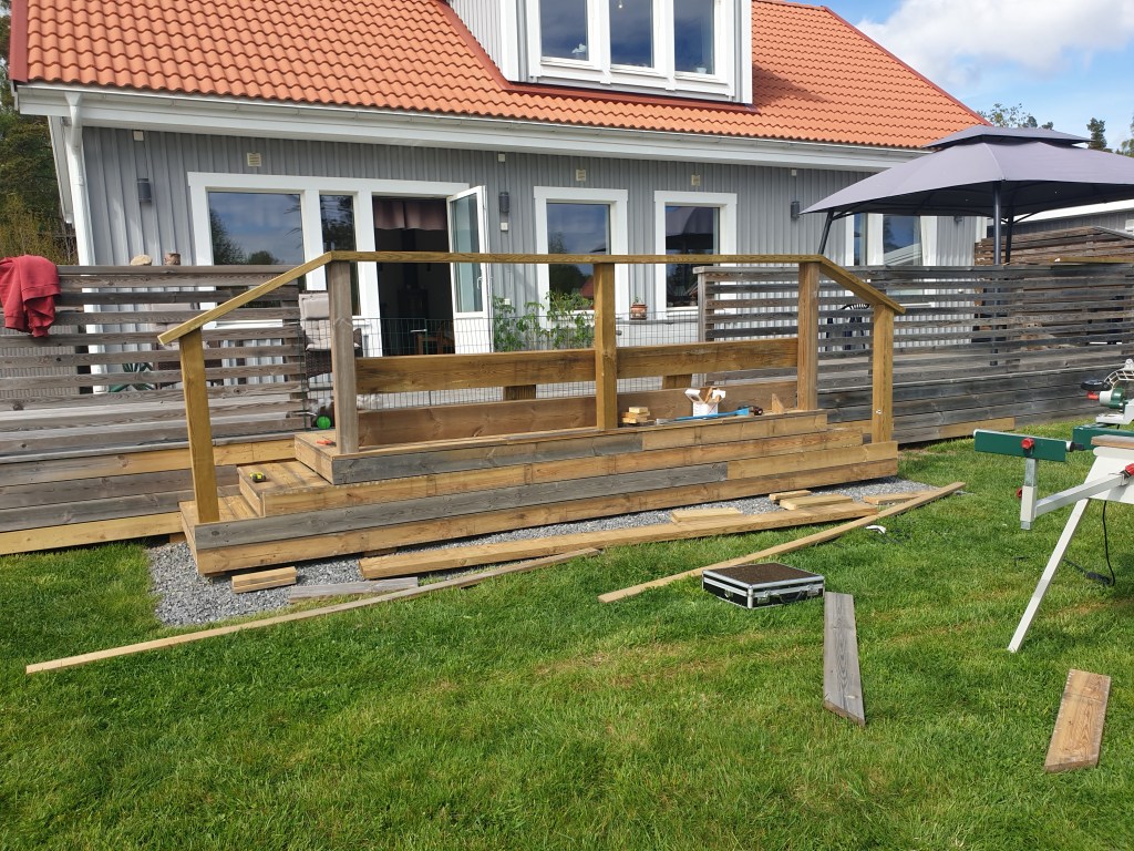 Arbetet har fått ta den tid det tar vilket inte är det normala för mig. Allt brukar vara planerat och sen kör jag tills det är färdigt! Den här gången hade jag bestämt mig för att inte köpa virke till den nya trappan utan återanvända så mycket som gick, jag fick köpa överliggaren, tre av stolparna (en stolpe som kapades givetvis) och ribborna i räcket. Rätt bra enligt mig. Detsamma gällde givetvis inte skruvarna men vi har en hel del ”arvegods” som vi gjorde av med så det blev bara trallskruv som behövdes.