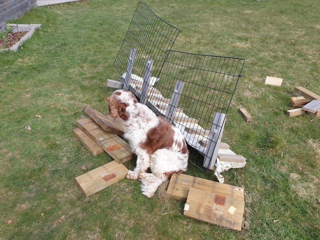 Arbetet avbröts rätt ofta av hundarna som gärna vill vara med. Knasen tar alla mindre träbitar, mindre bra när det är tryckimpregnerat, så de var vi tvungna att hålla koll på. Izidor vill mest att vi ska umgås med honom så han stör även han på sitt sätt. Hundarna älskar när vi jobbar ute och de kan delta!