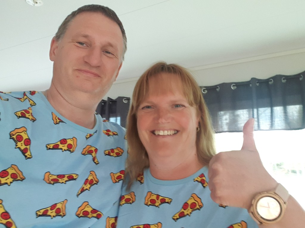 Vi har ju inte bara jobbat utan vi har givetvis umgåtts i det vi kallar för vår bubbla, vi och våra närmaste grannar. Förra helgen var det pizzakväll och vi hade skaffat ett par lämpliga t-shirts!