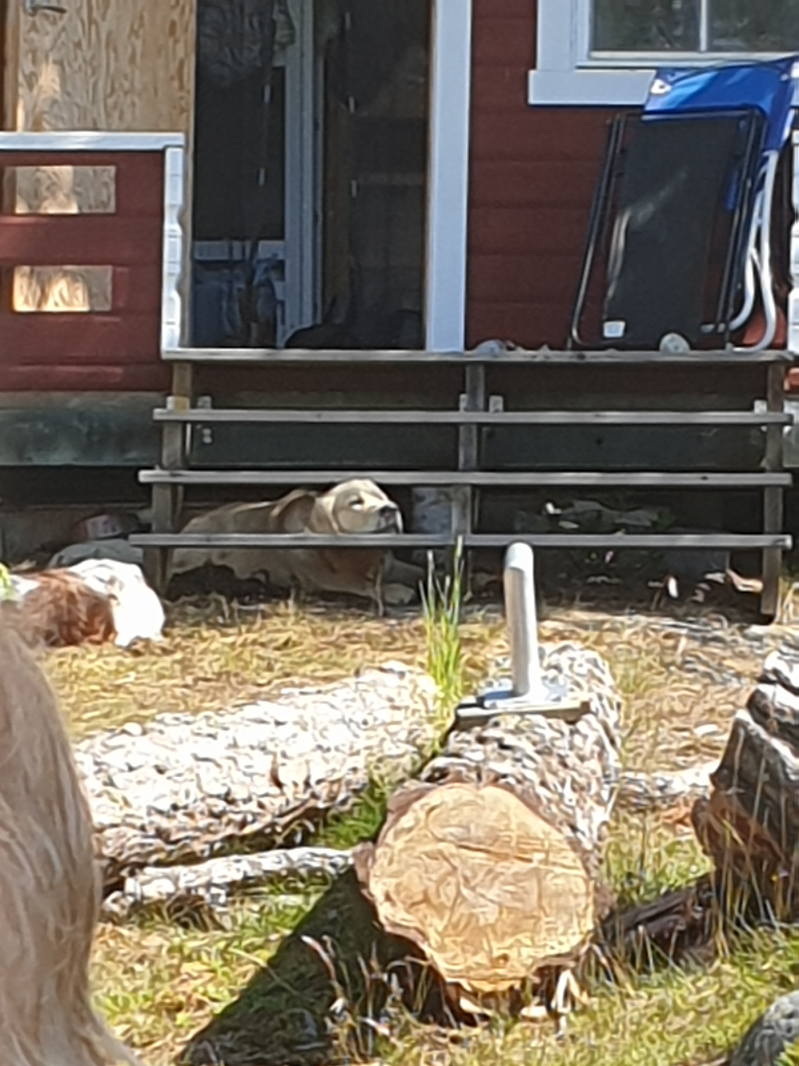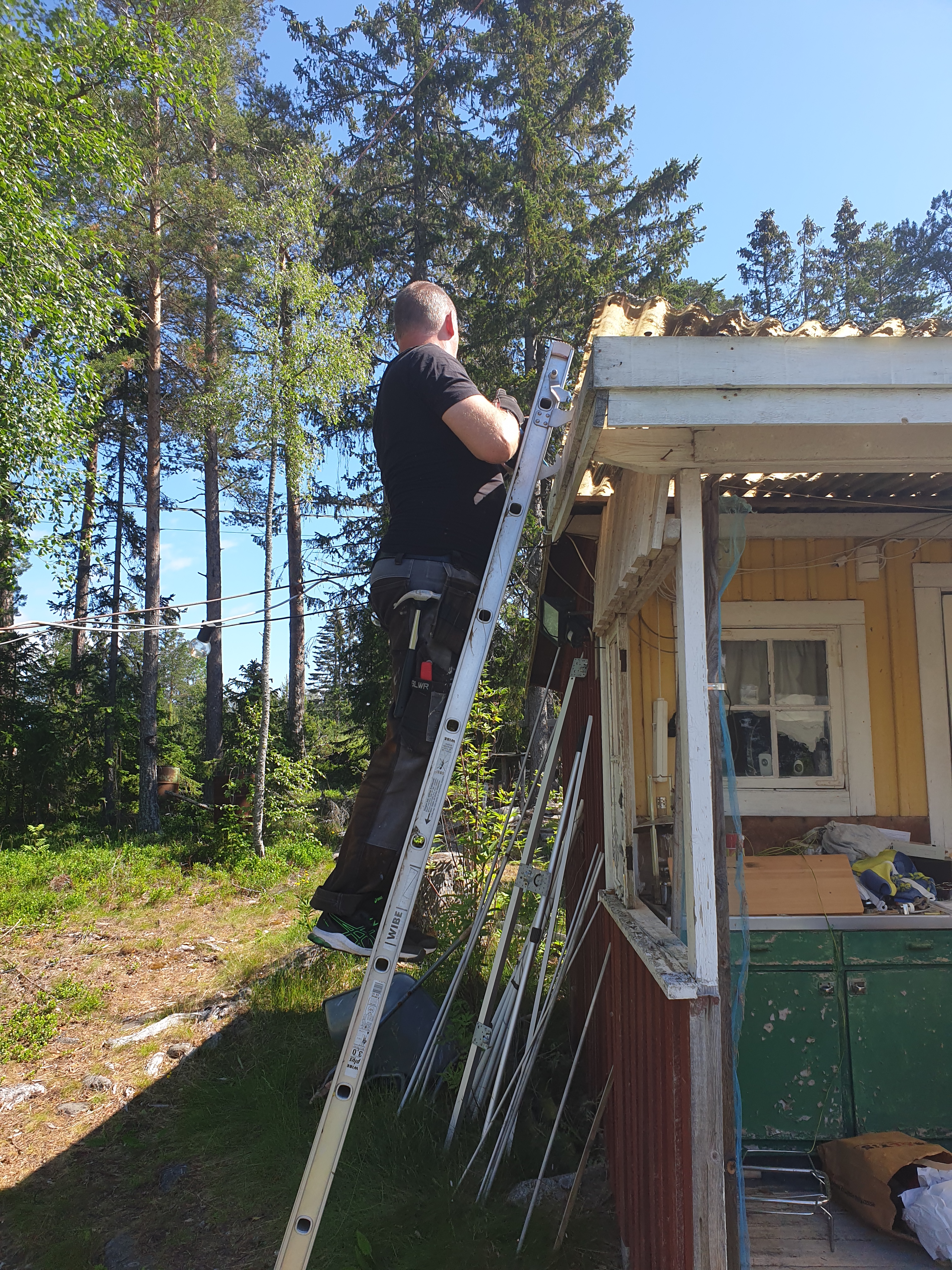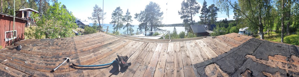 Målet var att riva ett plasttak för att så småningom sätta ett riktigt tak och dessutom riva bort takpappen på resterande tak och byta en del av planken i taket där åldern tagit ut sin rätt. Tyvärr hann vi inte lägga på ny papp utan nu är det presenning över hela huset i väntan på nya tag. Att jobba på tak är inte min favorit (höjdrädd som f-n!) och när dessutom delar av taket ska bytas pga ålder och annat som påverkar hållbarheten kändes det sådär men det var bara att sätta på jobbyxorna och klättra upp. Utsikten var ännu bättre för mig än de som satt nedanför som lite plåster på såren. På tal om plåster behövdes bara ett till Kent som rev sig på något när han drog ut spik.