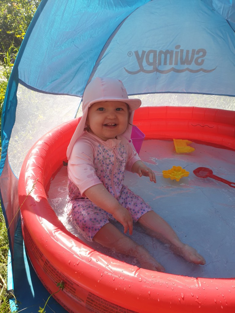 Vädret har mestadels varit bra och Junie fick en bassäng av Morfar som passade i hennes UV-tält. Både hon och kompisarnas dotter badade trots att vattnet var kallt.