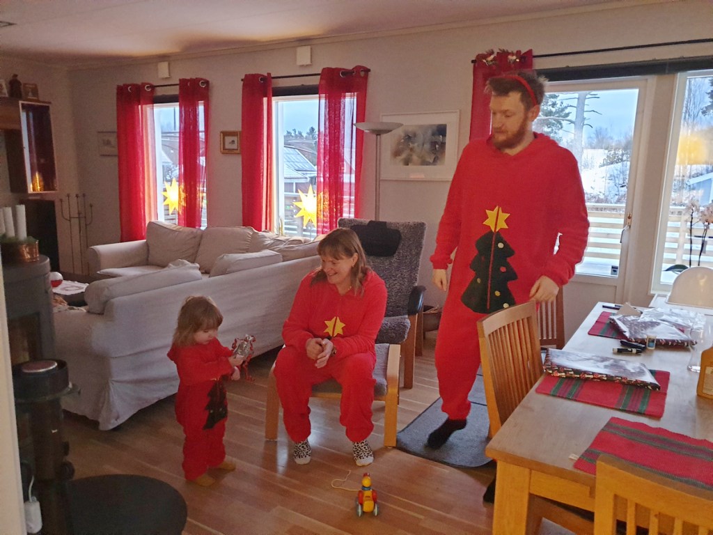 Inför julen hade Helén och Ellen fått för sig att vi skulle ha sparkdräkter på oss med jultema så det beställdes hem en var. När vi väl var ensamma fick Helén även för sig att vi skulle ha något på huvudet, jag gillar ju dock inte diadem…