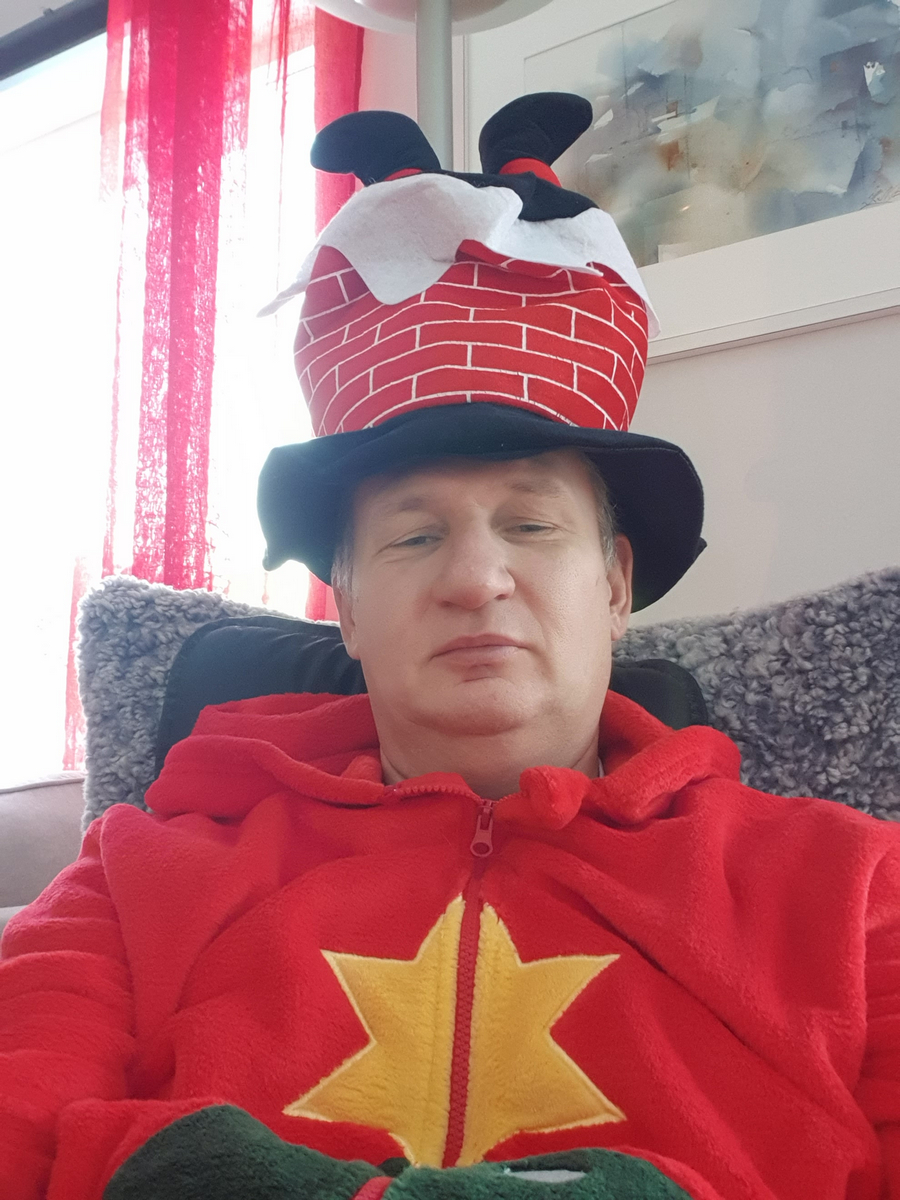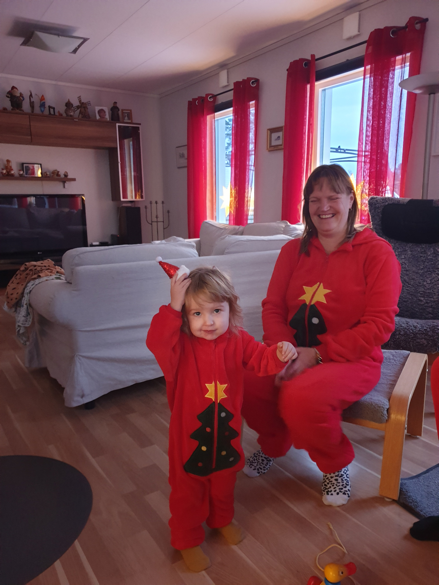 Inför julen hade Helén och Ellen fått för sig att vi skulle ha sparkdräkter på oss med jultema så det beställdes hem en var. När vi väl var ensamma fick Helén även för sig att vi skulle ha något på huvudet, jag gillar ju dock inte diadem…