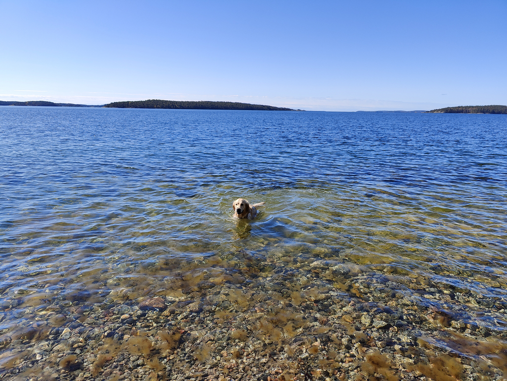 Knasen fastnade ju lite i isen ute på Möja men det verkar inte ha satt några spår, fortfarande helt tokig när det finns vatten som man skulle kunna bada i! Våra tidigare hundar spenderade ju stora delar av sina liv med att gå ut en kort liten bit men simma kunde jag göra själv! Knasen visar enbart glädje inför möjligheten att simma, nu hoppas vi att Gaston blir likadan.