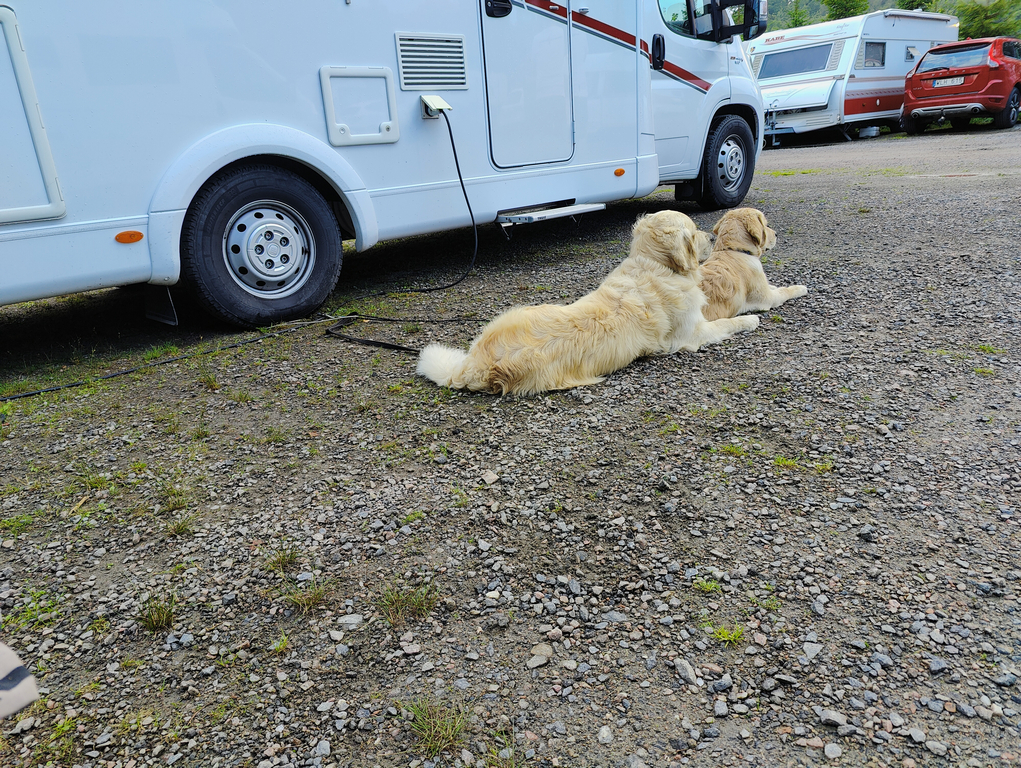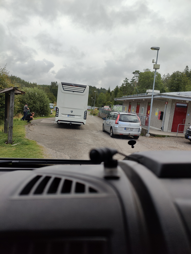 Jag passade givetvis på att tömma och fylla vatten i bilen men hade oturen att hamna bakom en lite större husbil som tömde gråvatten och fyllde sin enorma vattentank. Jag var även bakom en familj i en betydligt mycket mindre bil och små barn men de var lite snabbare.