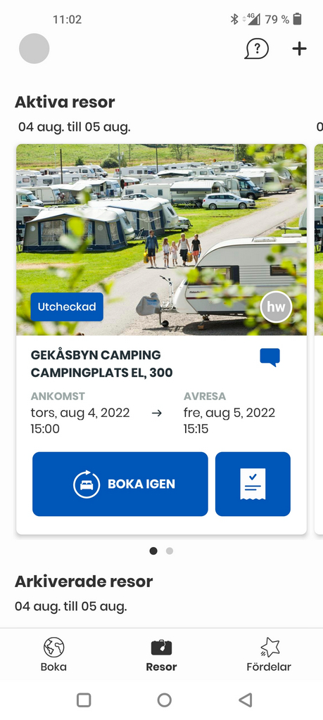 Vi hade bokat och betalt via nätet och hade nån dag innan fått en länk för att checka in. Vi hämtade även ner appen Aeroguest där vi fick reda på att vår plats var ledig strax före tre som är den egentliga incheckningstiden, mycket smidigt. Tanken är att appen och telefonen ska fungera som passerkort (och allt annat också) vilket vi inte behövde testa eftersom 300-området inte är spärrat av en bom och servicehuset inte heller behöver passerkort. Reaktionerna på nätet om appen är blandade, vissa älskar den andra inte, men ett problem är ju att passerkort/nyckel blir kopplat till en viss telefon om man inte lyckas dela den med andra personer. Jag testade att dela bokningen och allt verkade funka men som sagt behövdes inget kort där vi stod.