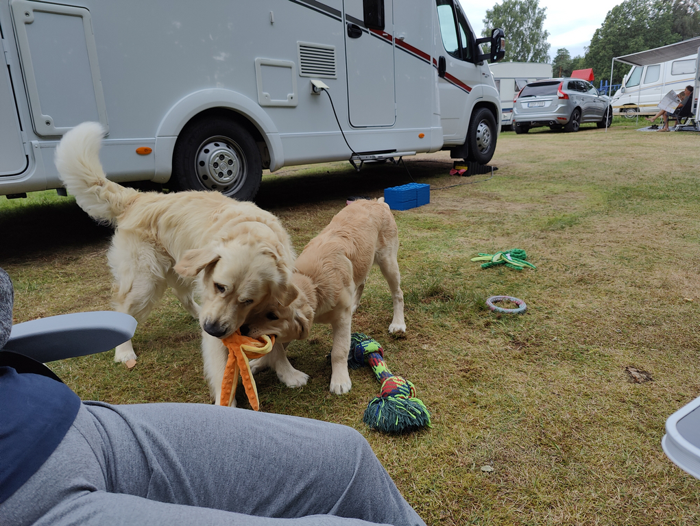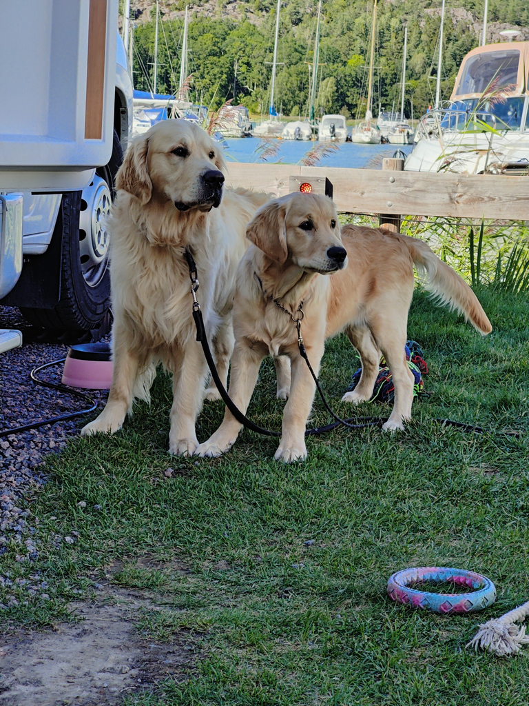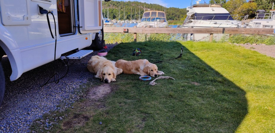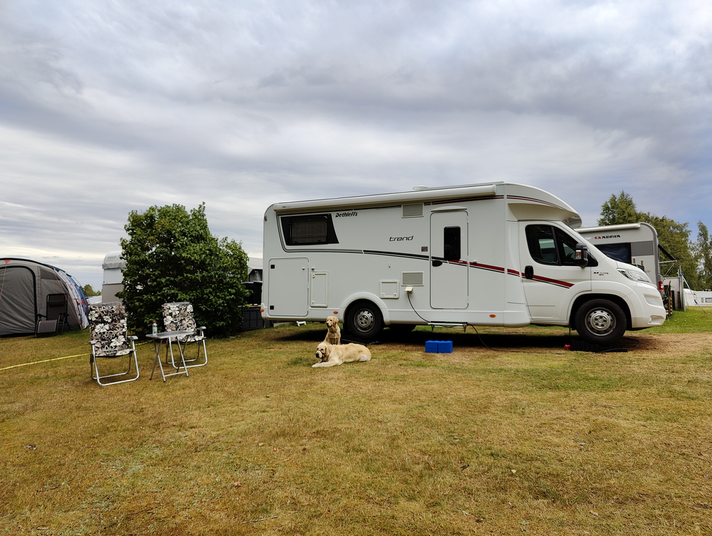 Hundarna trivdes alldeles utmärkt på gräsplätten som är vid varje plats även om bilen parkeras på grus, precis som vi vill ha det! En grej med hundar är att promenader har en tendens att ta längre tid än väntat helt enkelt eftersom trevliga människor vill hälsa på hundarna och berätta lite om deras egna eller fråga hur det fungerar i husbilen etc. Så även här, husbilslivet ger många kontakter även om de absolut flesta är flyktiga så är det kul att träffa lite trevligt folk och snacka ett tag.