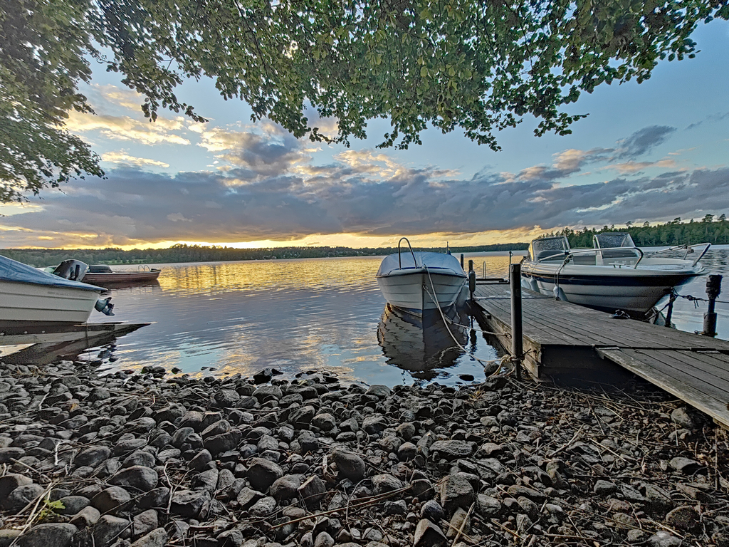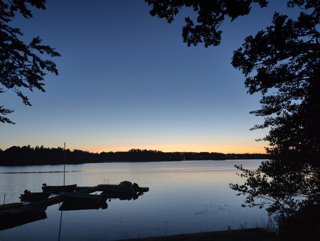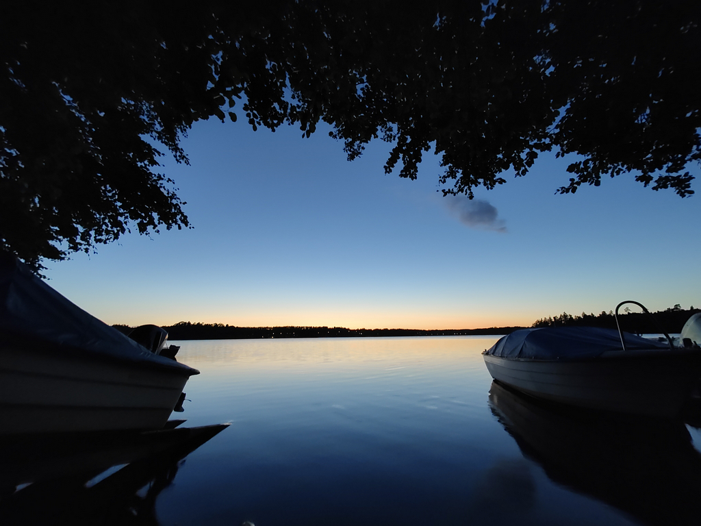 Om man tog sig ner förbi träden som var vår utsikt kom man direkt till sjön som bjöd på en helt underbar utsikt när solen var på väg ner, bara att ta fram telefonen och krypa ner i lagom fotohöjd! Otroligt nöjd med kameran i våra OnePlus-telefoner med Hasselbladsoptik.