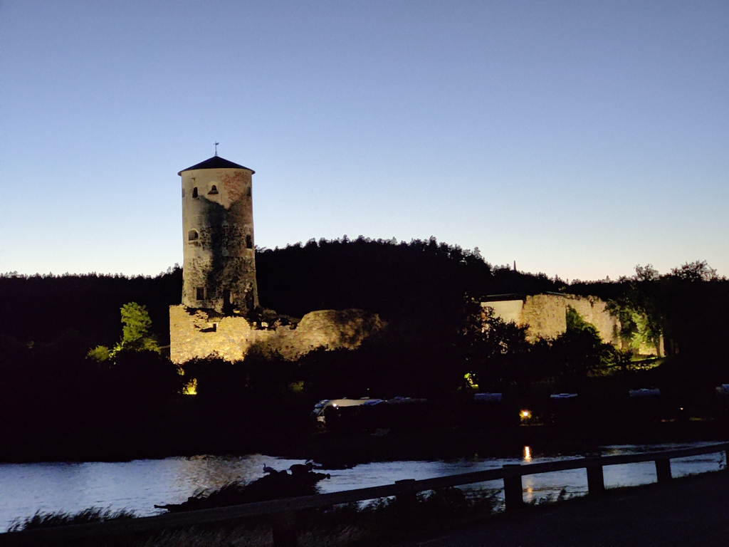 Vi gick ut till slottsruinen men gick inte in, det var varmt! Jag tog dock lite bilder på kvällen när slottsruinen är upplyst. Vi pratade även lite med kvinnan i båten till höger framför oss som hade två hundar (tror Amstaff) som uppförde sig exemplariskt, den ena var valp precis som Gaston så det blev lite promenader titt som tätt även för dem.