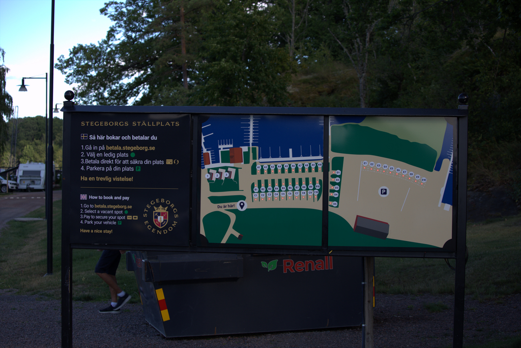 Smidigt att boka och betala via nätet enligt oss och lite kul är det att de har en tavla där de upptagna platserna lyser rött, det finns även en grön/röd indikator på varje plats så man kan åka dit på en chansning och leta upp en plats som är både fin och ledig. På platserna där vi stod var det tydligt skrivet att man skulle köra in vilket är logiskt för oss med husbil som gärna vill ha utsikt genom vindrutan. För övrigt är både husbilar och husvagnar välkomna vilket inte är ”normalt” på ställplatser.