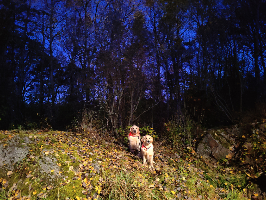 På morgonpromenaden känns det att hösten är på gång ordentligt. Lysande halsband på hundarna och reflexer på mig är numera en självklarhet strax efter sex på morgonen! Rätt kul att höra barnens frågor och föräldrarnas svar om halsbanden när jag passerar en förskola i slutet av promenaden, förra året var det ett barn som kallade dem för julhundar.