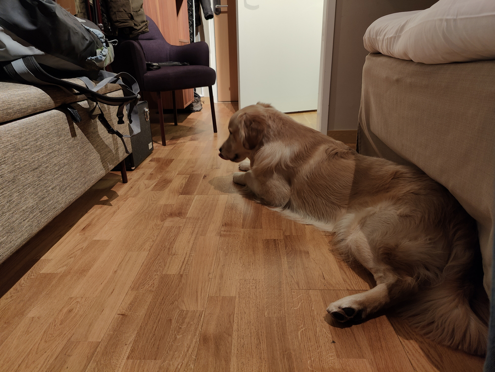 Första gången för Gaston på hotell och första gången han blir lämnad ensam i ett för honom okänt rum, lite orolig i början men han kopplade snabbt av och vi hörde inte ett ljud från rummet när vi lämnade honom för att äta, mycket trygg kille även om han har väldigt mycket energi!