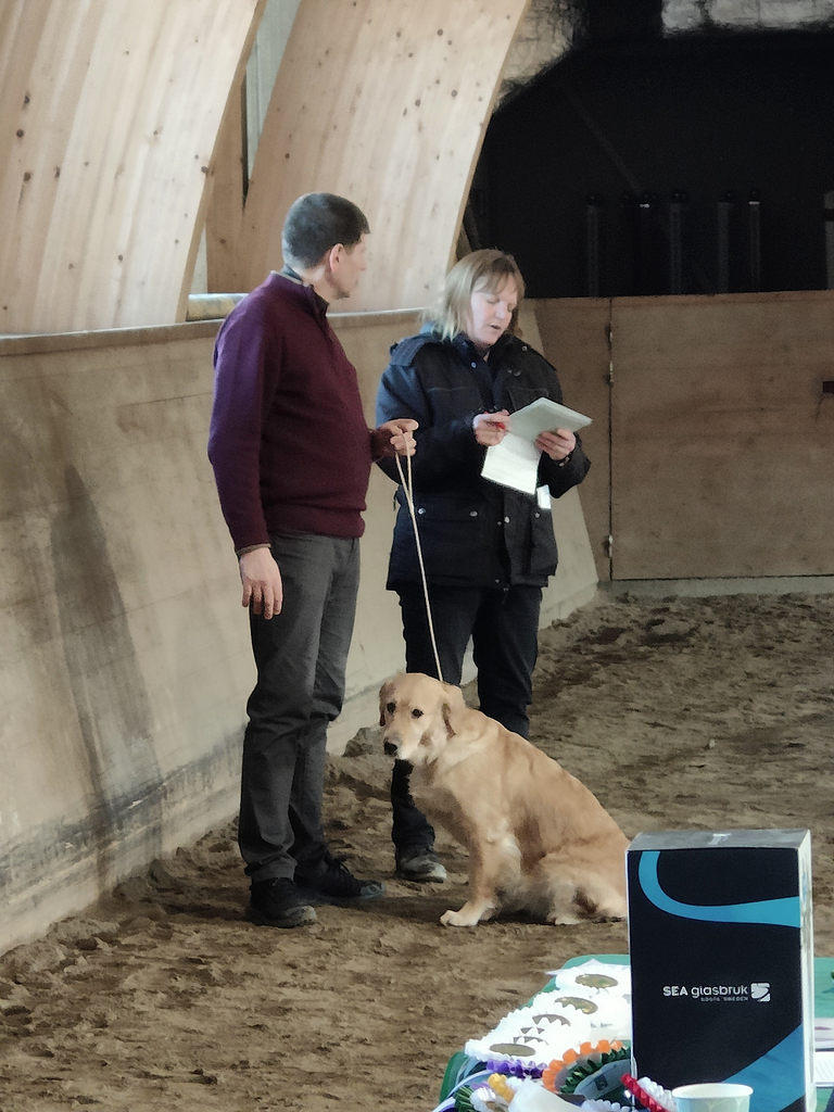 Lördagens utställning var i ett kallt ridhus i Hallstahammar där vi blev överraskade av att vår mycket gode vän Göran var på plats för att ställa ut sin tik Diza, han lyckades dessutom ta en sväng iväg och få henne godkänd på doften Eukalyptus och ögonlysa henne med godkänt resultat! Han behövde dock lite hjälp med att skriva pappren så Helén fick fixa den biten under tiden han visade upp Diza i ringen.