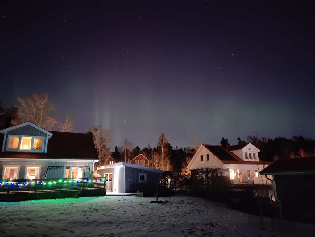 En mycket bra helg i goda vänners lag som fortsatte med något som jag längtat efter! När vi lagt oss och precis höll på att somna ringde vår underbara granne Sara och sa att det är norrsken! Jag for ut och fick se mitt första norrsken hemma hos oss! Norrskenet syntes precis utan kamera när jag kom ut men sen kunde man se det ett tag till genom mobilens kamera. På måndagskvällen var vi beredda och jag gick ut vid kvart i tio ungefär och ropade ut Helén direkt så även hon fick se norrsken hemma hos oss, hon har ju sett ännu bättre uppe i Sundsvall förra året men nu även hemma.