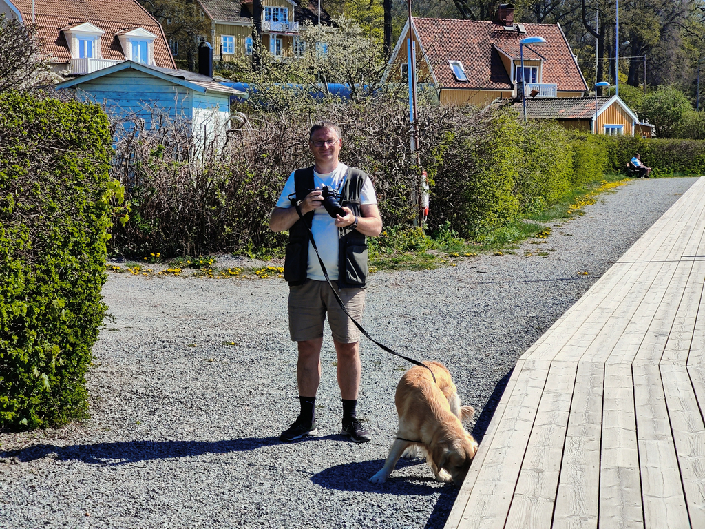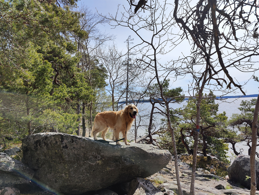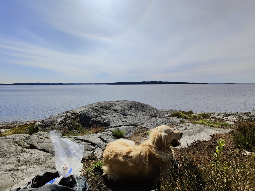 Samma sak den helgen med mycket skönt väder så promenaden/vandringen blev i shorts och t-shirt. Jag mötte en grupp joggare på första delen av slingan som går i skog och har rätt behaglig terräng att röra sig i med bra underlag och inte alltför mycket upp och ner. När slingan vänder vid Morarnas hembygdsmuseum (stängt just då) går den längs stranden och består till stor del av sten som underlag och en hel del upp- och ner i varierande grad av jobbighet. Blir det jobbigt tar man en paus och delar en macka med hunden och bara myser. När jag satt där med koppen kom joggarna tillbaka, starkt jobbat! En mysig dag tillsammans med Knasen där vi tankade energi på bästa möjliga sätt.