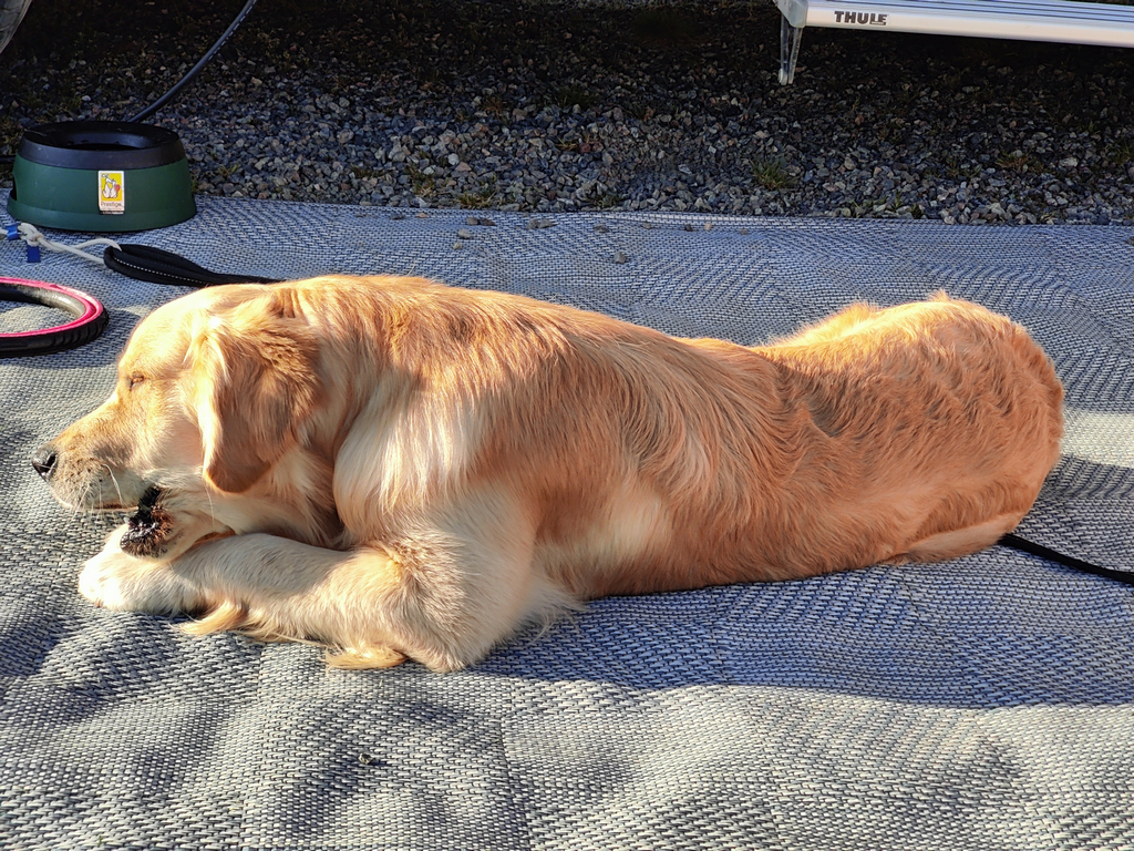 Årets första riktigt sköna ”vi äter alla måltider ute” blev det eftersom vädret var riktigt härligt, varmt, soligt och med bara svag vind. Markisen fick vi dra ut för hundarnas skull men även vi fick söka skydd för solen, vi har ju inte direkt varit ute och pressat i solen under våren.