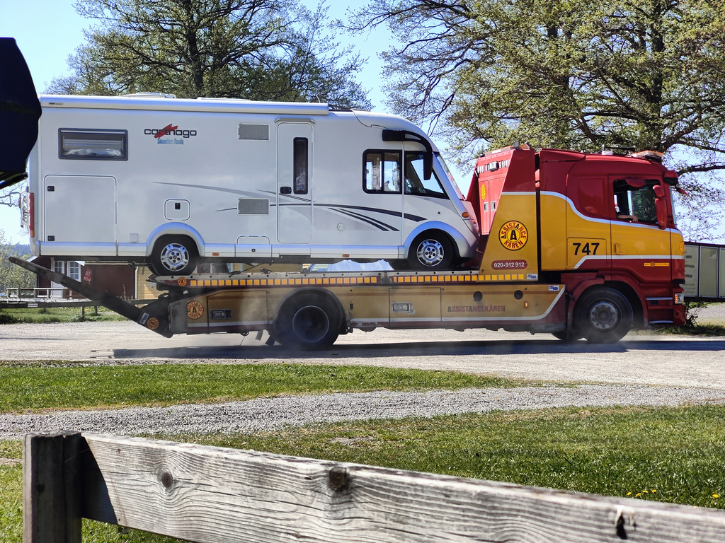 Rätt stora problem verkar det som eftersom det kom en bärgare som precis kunde få plats med husbilen på sitt flak. Två äldre herrar skötte bärgningen som tog lite tid, även om campingen är rätt frikostig med utrymme så blir det trångt när det blir bärgning, och så småningom kom de iväg, de som hade husbilen tog sig iväg med en personbil som de fixat fram under helgen. Tråkigt när det blir så men nån gång ska man väl åka bärgare, min första (hittills enda) gång var för sådär trettio år sen när något inte monterats rätt på verkstan vid bromsbyte så ena styrleden lossnade på motorvägen.