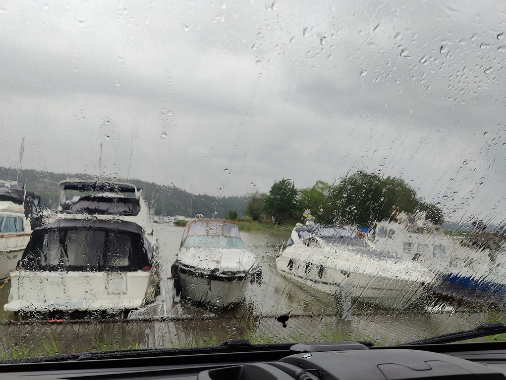 Precis som utlovat regnade det en del under natten och när en av hundarna var lite orolig på morgonen (vi misstänkte magstrul men det var falskt alarm) och det just då knappt duggade gick jag ut med dem redan vid sextiden. Väl tillbaka satt jag och läste tills Helén vaknade i lite mer lagom söndagstid och vid frukosten var vi överens om att vi skulle åka hemåt när vi var färdiga.