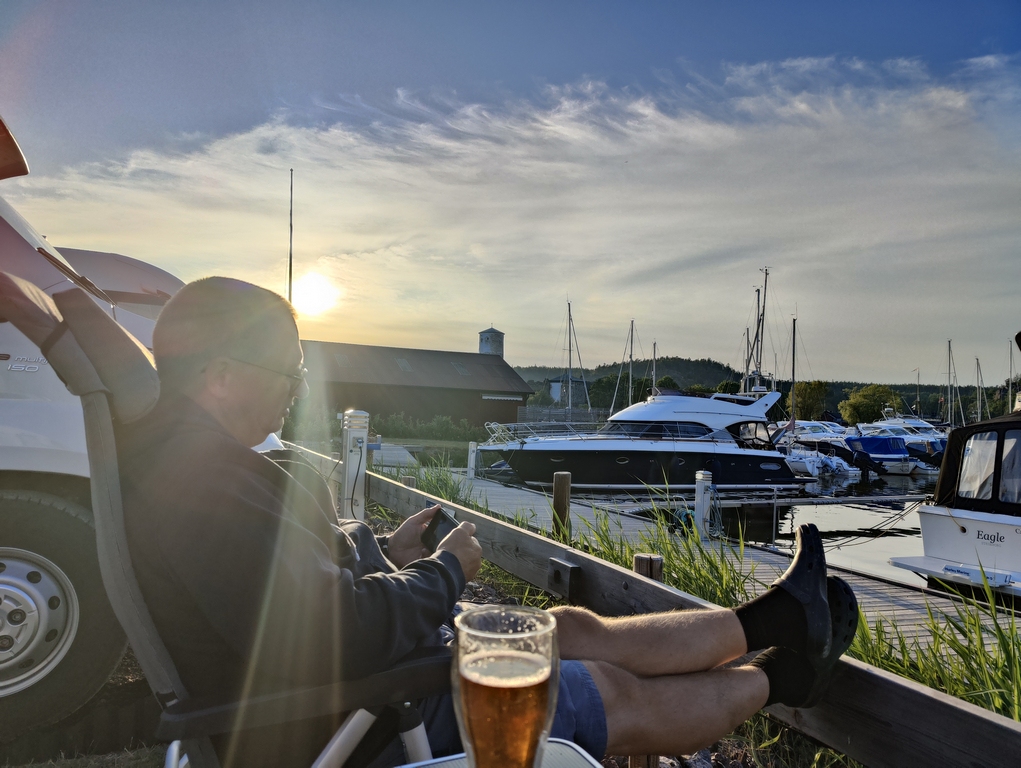 Vi tog en promenad med hundarna direkt när vi kom fram eftersom klockan passerat fyra då de brukar vilja gå ut när vi är hemma och promenerade en bit på Östgötaleden tills hundarna verkade vara nöjda. Tillbaka till husbilen flyttade jag lite på den och körde upp på klossarna så vi slapp luta lite framåt och sen var det dags att plocka fram allt och bara njuta!