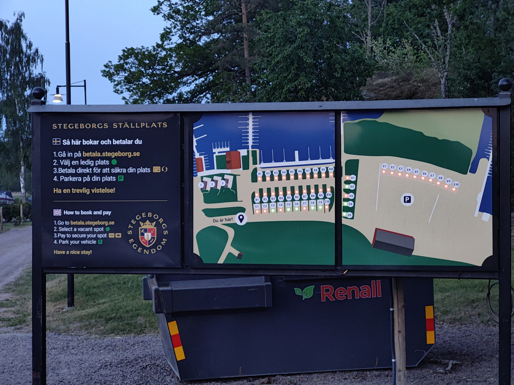 Vi ville åka någonstans med hade lite svårt att bestämma oss för vart. Efter lite funderande valde vi Stegeborgs ställplats ute i Söderköpings skärgård där vi avslutade förra årets semesterresa. Bokning via deras hemsida fungerade precis som förra gången alldeles utmärkt och vi fick plats A4 precis framme vid vattnet. En kul detalj är att bilarna i första raden ska köra in och de i andra raden ska backa och står förskjutna mot första raden, alla har utsikt mot vattnet med andra ord!
