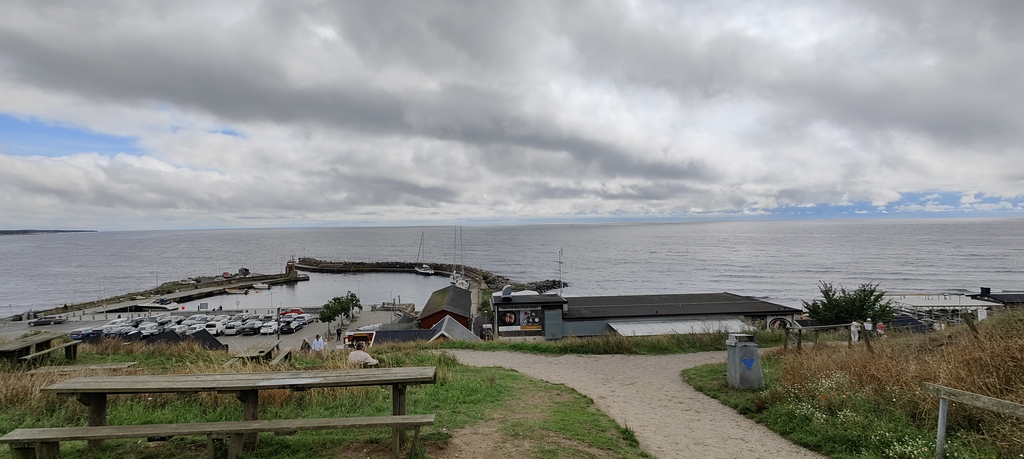 Från Ales stenar går det en hyfsad liten promenadväg ner till hamnen som är klart sevärd bara som hamn och utsikt men samhället har skapat några restauranger och butiker med fokus på fisk. Riktigt trevlig upplevelse även om det enda vi köpte var varsin glass. Rätt mycket folk med tanke på ytan men inte ens jag upplevde det som trångt. Trångt var det dock på parkeringen i hamnen och de flesta som ville ställa bilen där nere fick vända och åka upp i samhället igen.